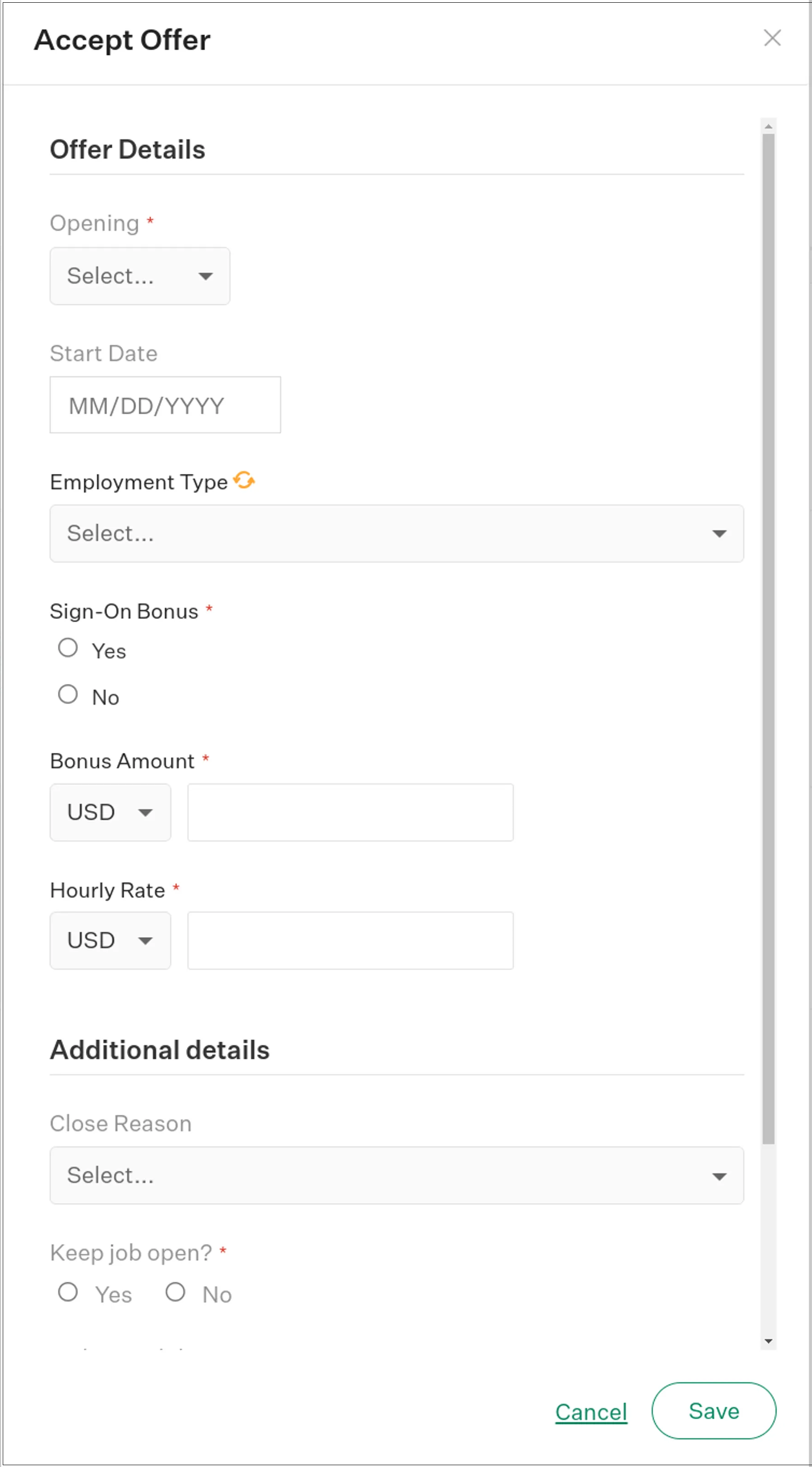 - Fill in the mandatory information in the modal below. Start Date will be the same as hired date, and Employment Type will also be synced over.