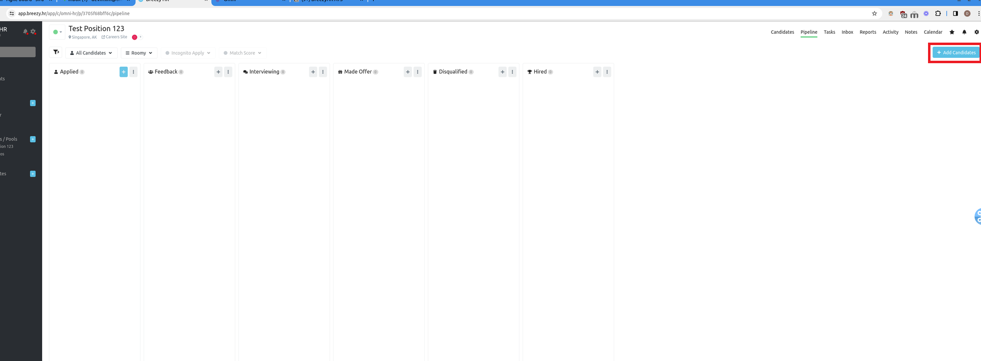 When viewing the details of the position, there will be an Add Candidate button at the top right to create a new candidate with that position, and to input the status to create it from