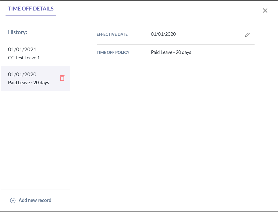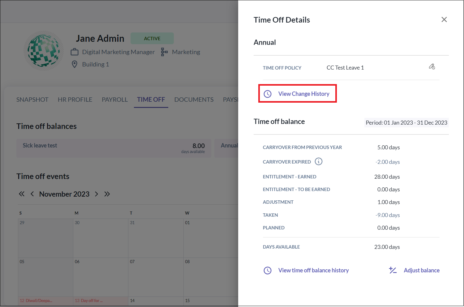 - If you want to see/edit previous time off policies under a specific time off type, click on the Time Off type you want (under Time off Balances) > View Change History