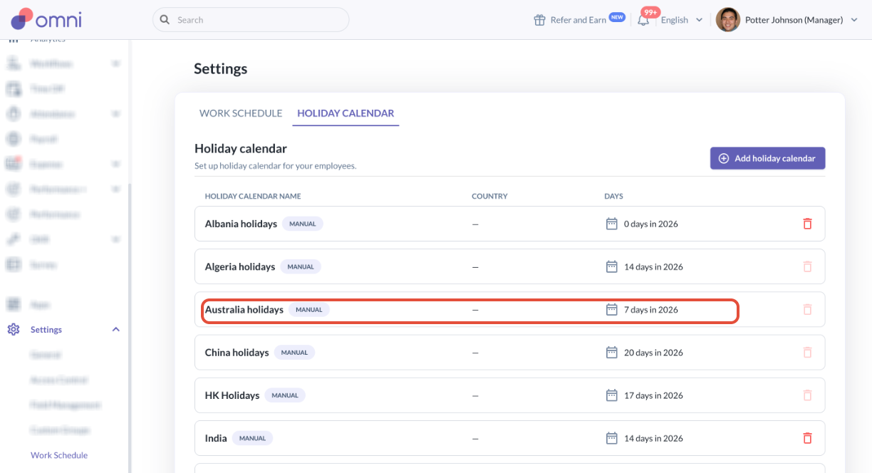 - Go to Settings > Work Schedule > Holiday Calendar > click the Holiday Calendar that is labeled manual you want to update.