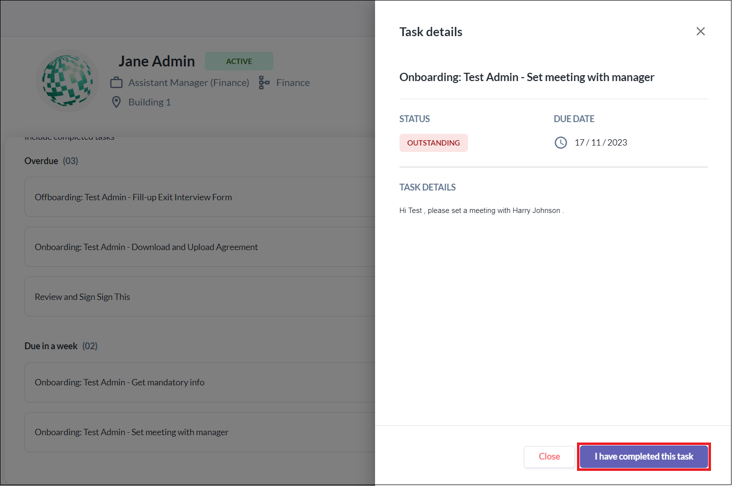 - Select the task you want to complete. A side pop-up will appear with the topline details of the task.
