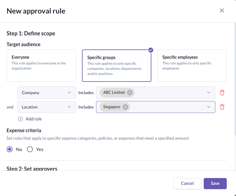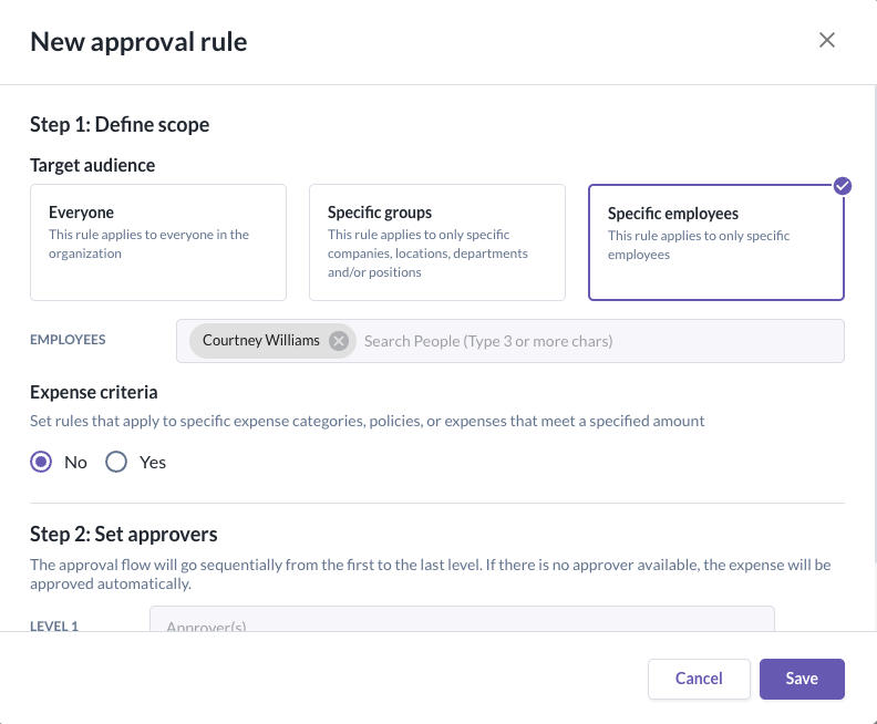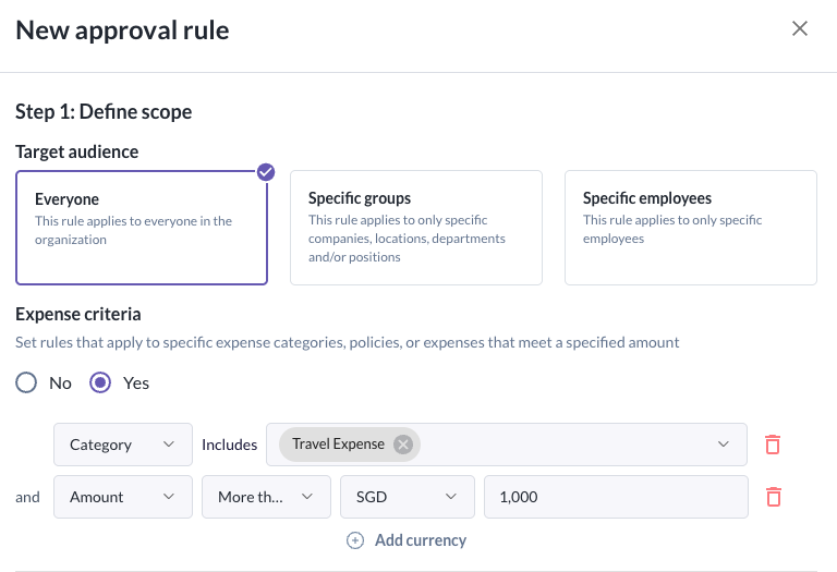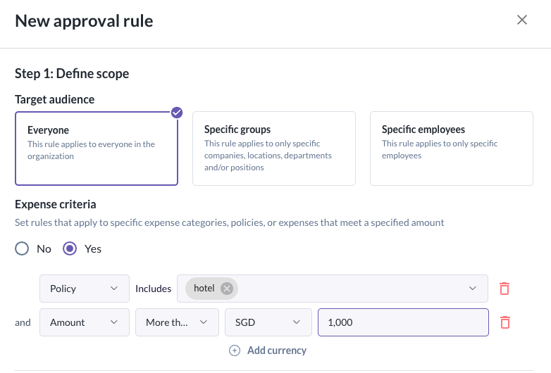 - When you set the criteria to one expense policy, the approval rule will apply only to that policy.