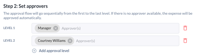 - You can set more than 1 approver in 1 level. Take note that only 1 approval in 1 level is needed to advance the expense approval to the next level.