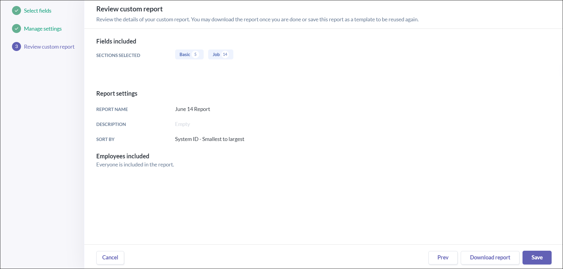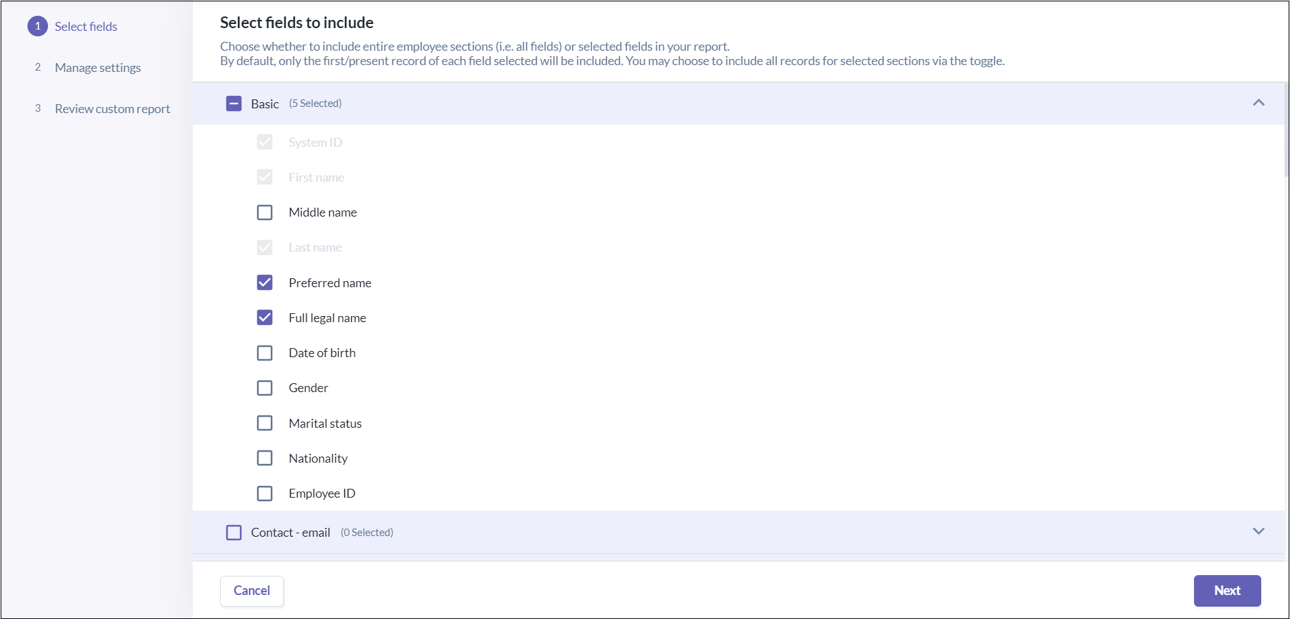 • Choose the sections and fields you want to include in your report.