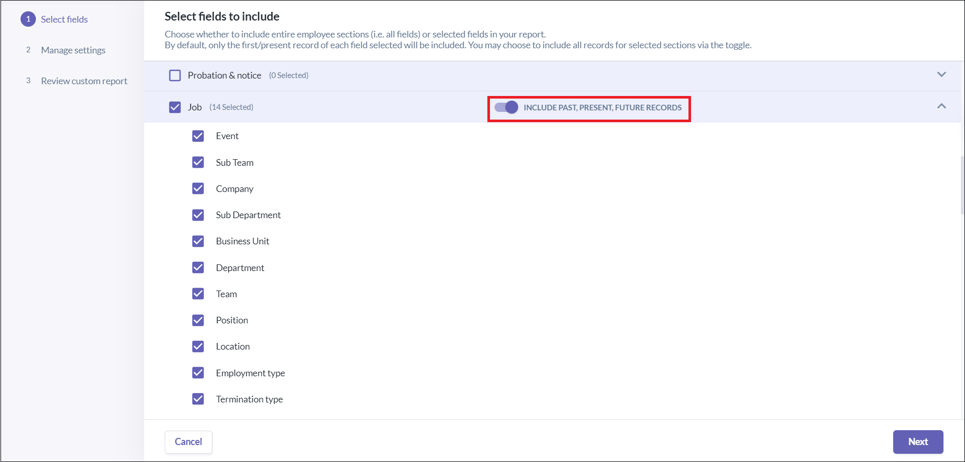 • There are sections and fields where a button called "Include Past, Present, Future Records" will show when you tick them. This is because these either have multiple entries or have historical/upcoming records, and the full record will be included when the button is turned on. Listed below are these sections. Note that in every report, you can only select 1 of these sections/fields to be included in full: