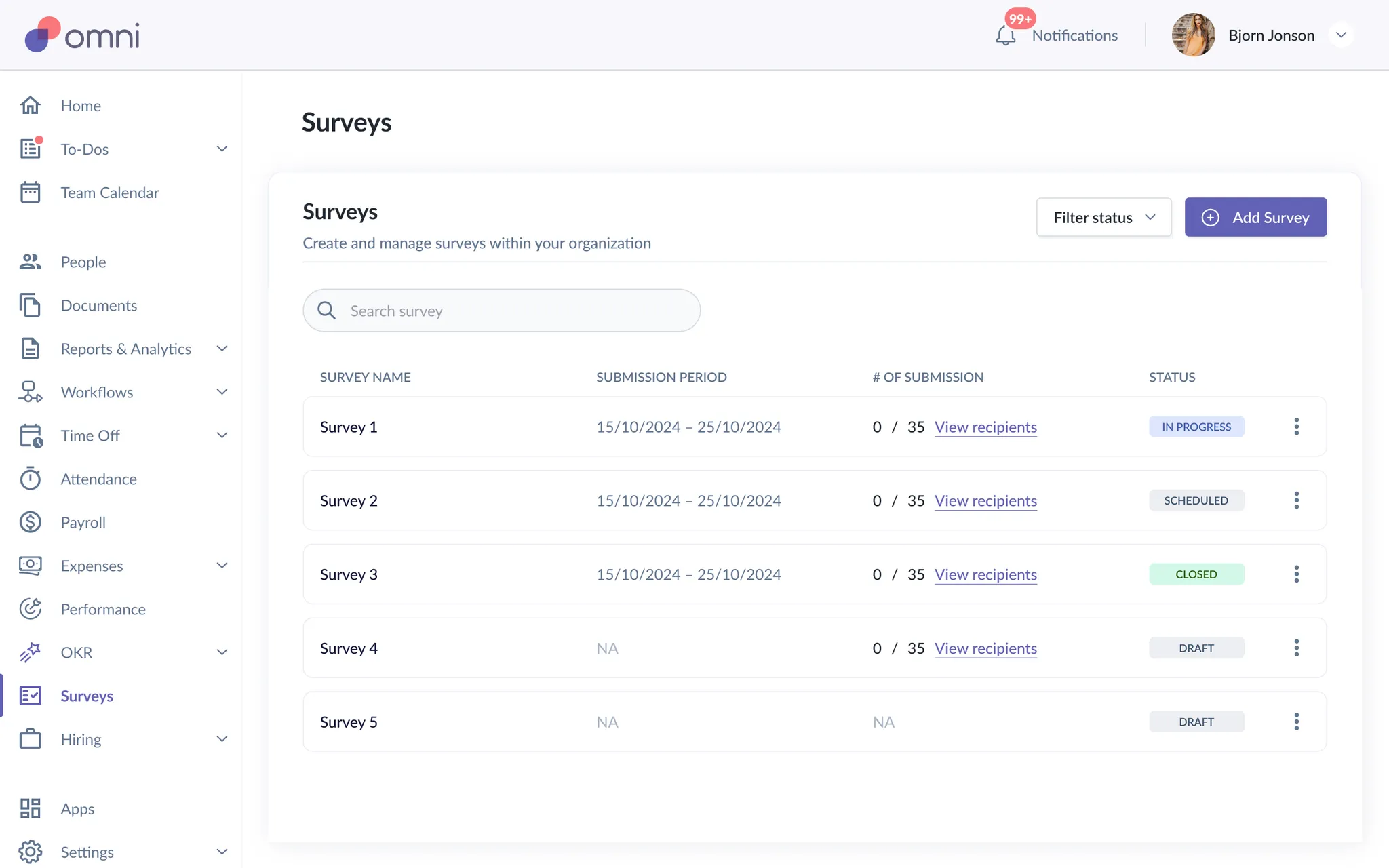The survey list also features a Status Filter, enabling Admins to quickly filter surveys by their current status.
