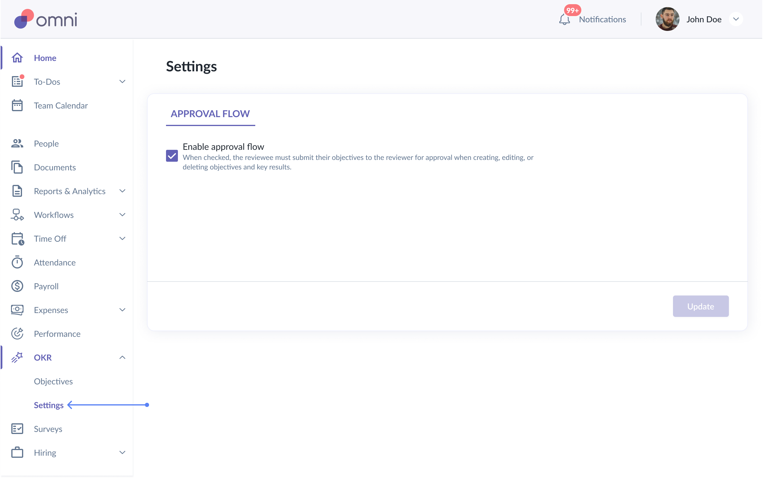 Before you start working with OKR approval statuses, it’s important to know how the Approval Flow can be toggled on or off. This setting will dictate how OKRs are handled and which actions are available for employees and managers.
