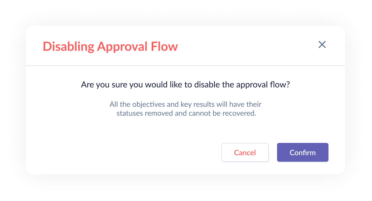 - Users will see a pop-up below, informing them by disabling the approval flow, all current OKRs statuses will be removed and not be recovered.