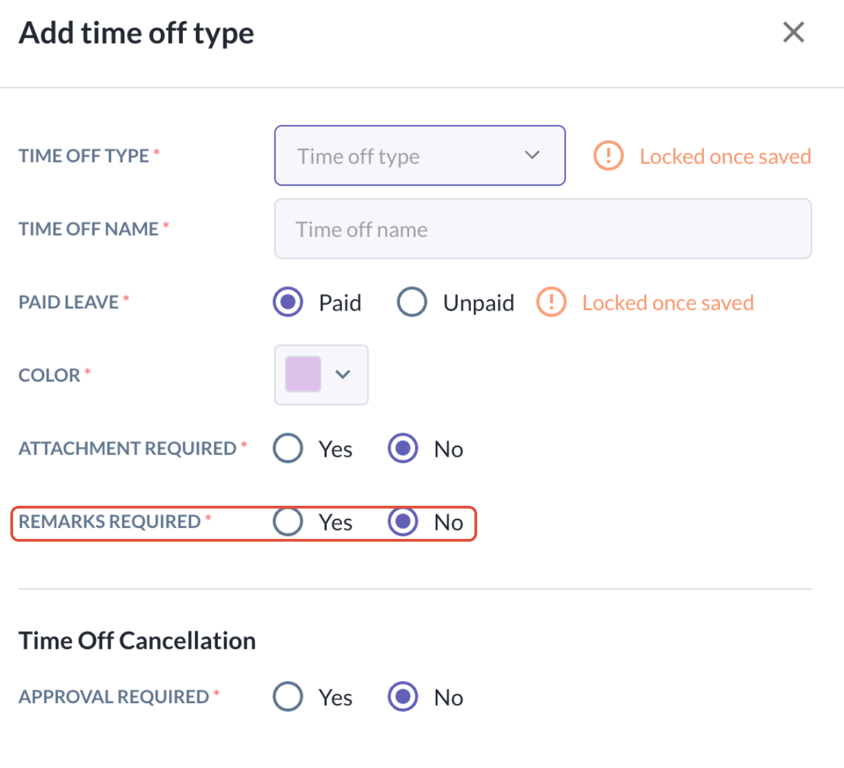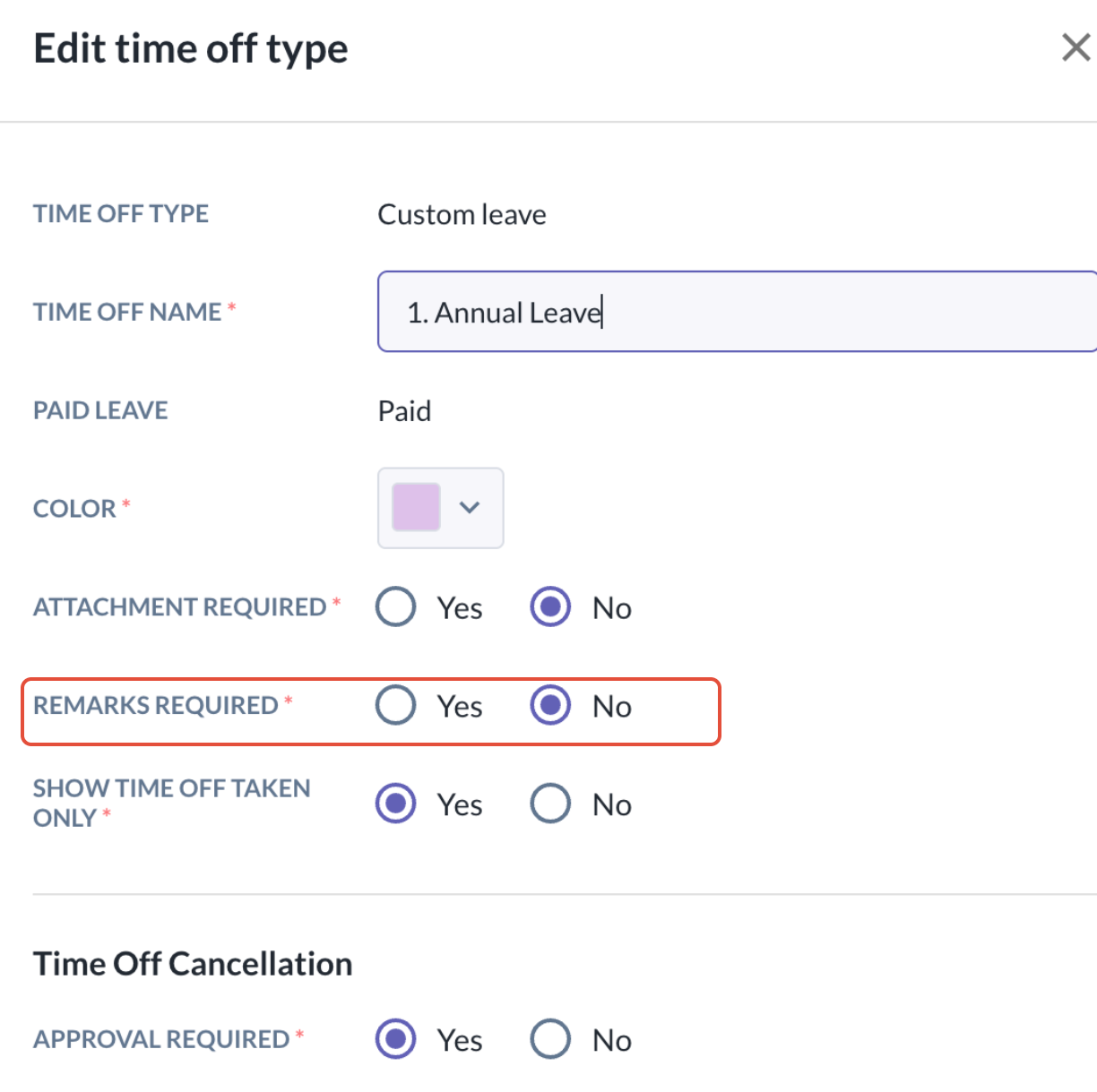 - Go to Time Off > Time off Type > Add Time Off Type > Toggle Yes or No for Remarks Required