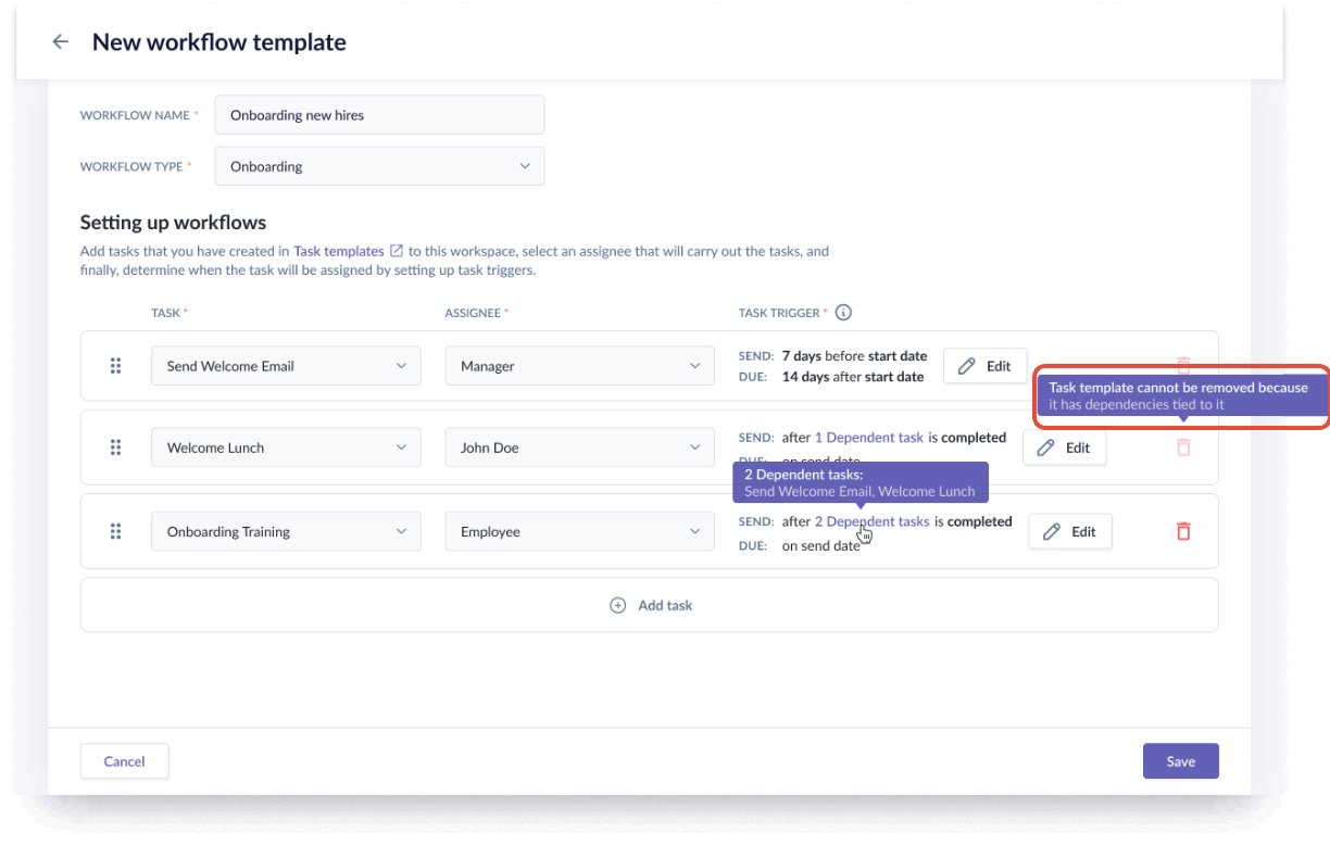 - A task cannot be deleted when there are dependencies tied to it within the workflow
