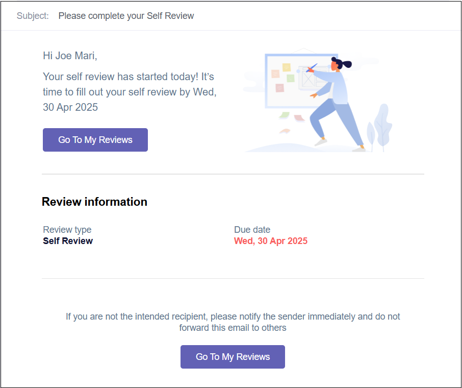 - For example, the Self Reviewee start date is April 25, 2025. The Self Reviewee will then get the notification on this date, and will be able to start answering the review by then. Same is true for the other persona reviewers: Manager, Peer, Upward, Secondary Manager.