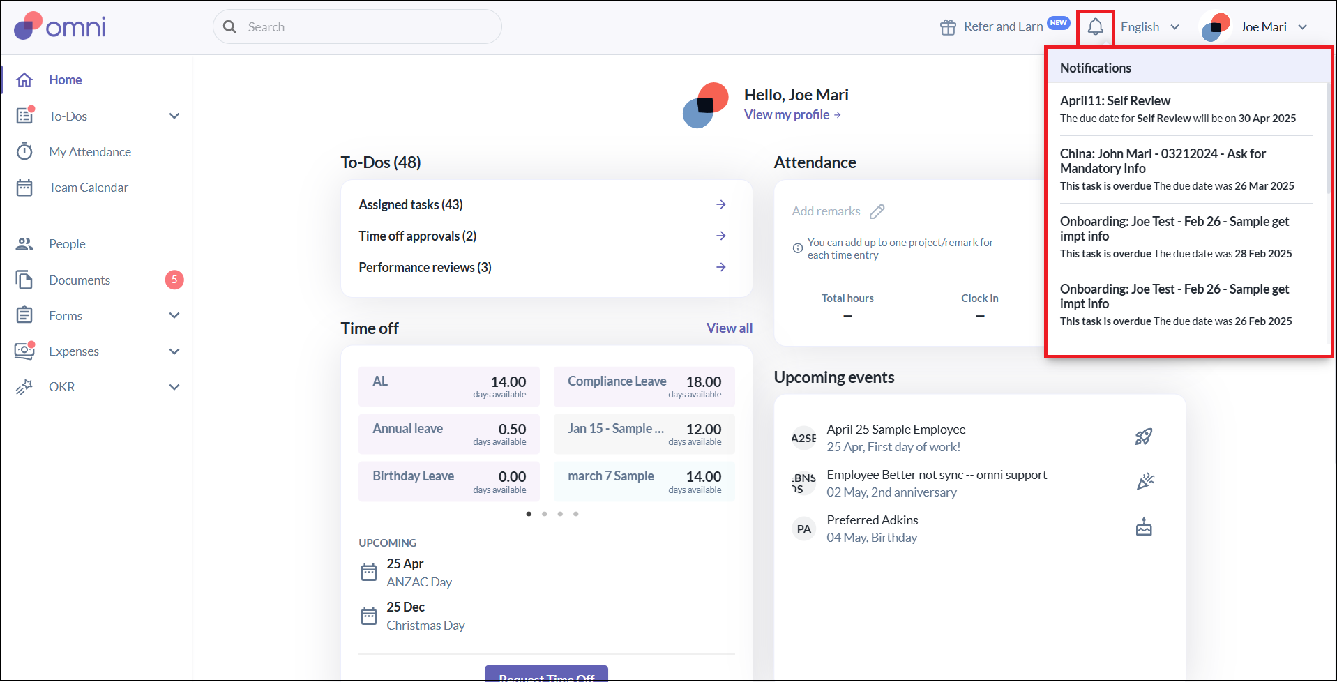 - Notification Bell: Second, the system can also notify employees through the notification bell at the top right of the interface.