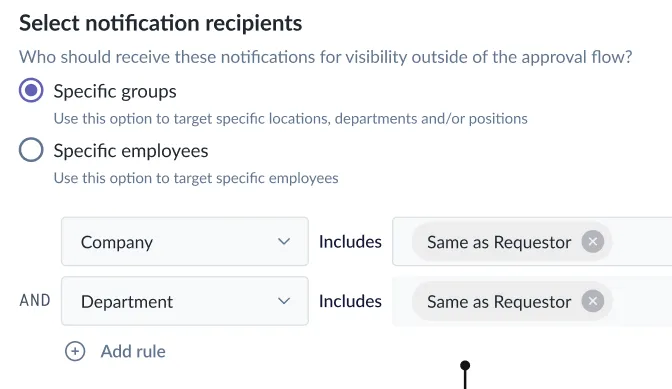 You can choose specific users or set dynamic rules, such as notifying users in the same department as the requestor. Notifications can also be tailored to be sent during the initial request, after final approval, or both.