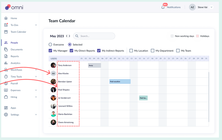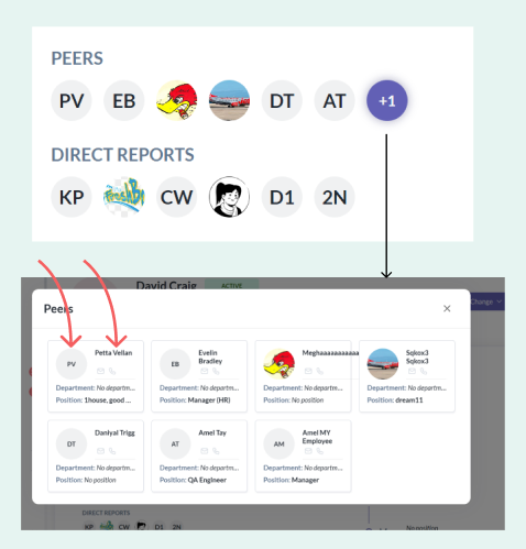 Team section (Manager, Peers, Direct Reports)