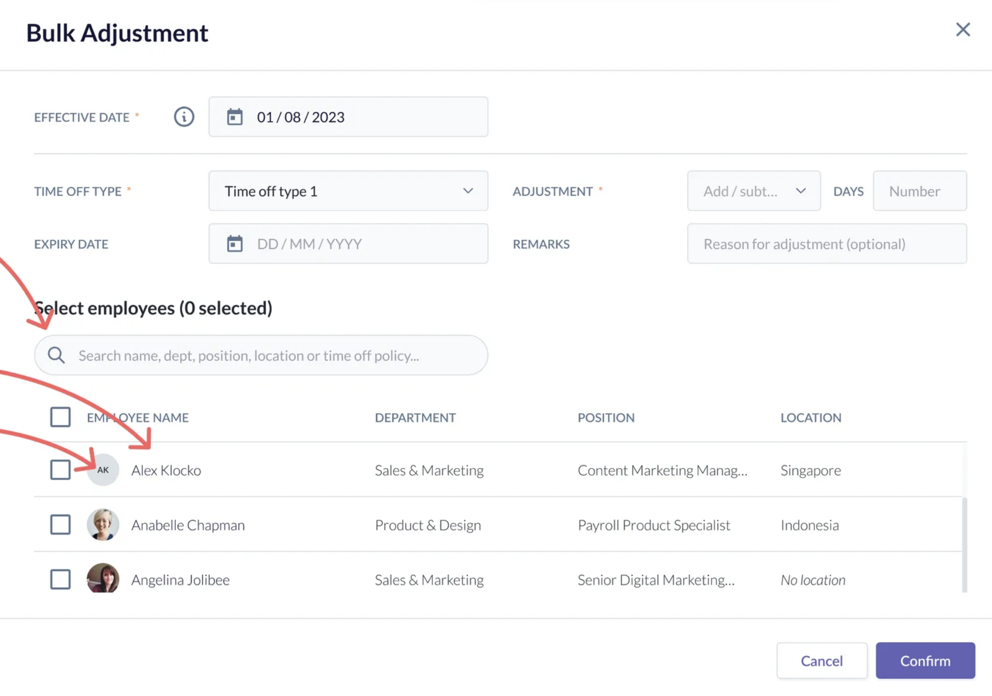 Bulk Adjustment > Select employees table