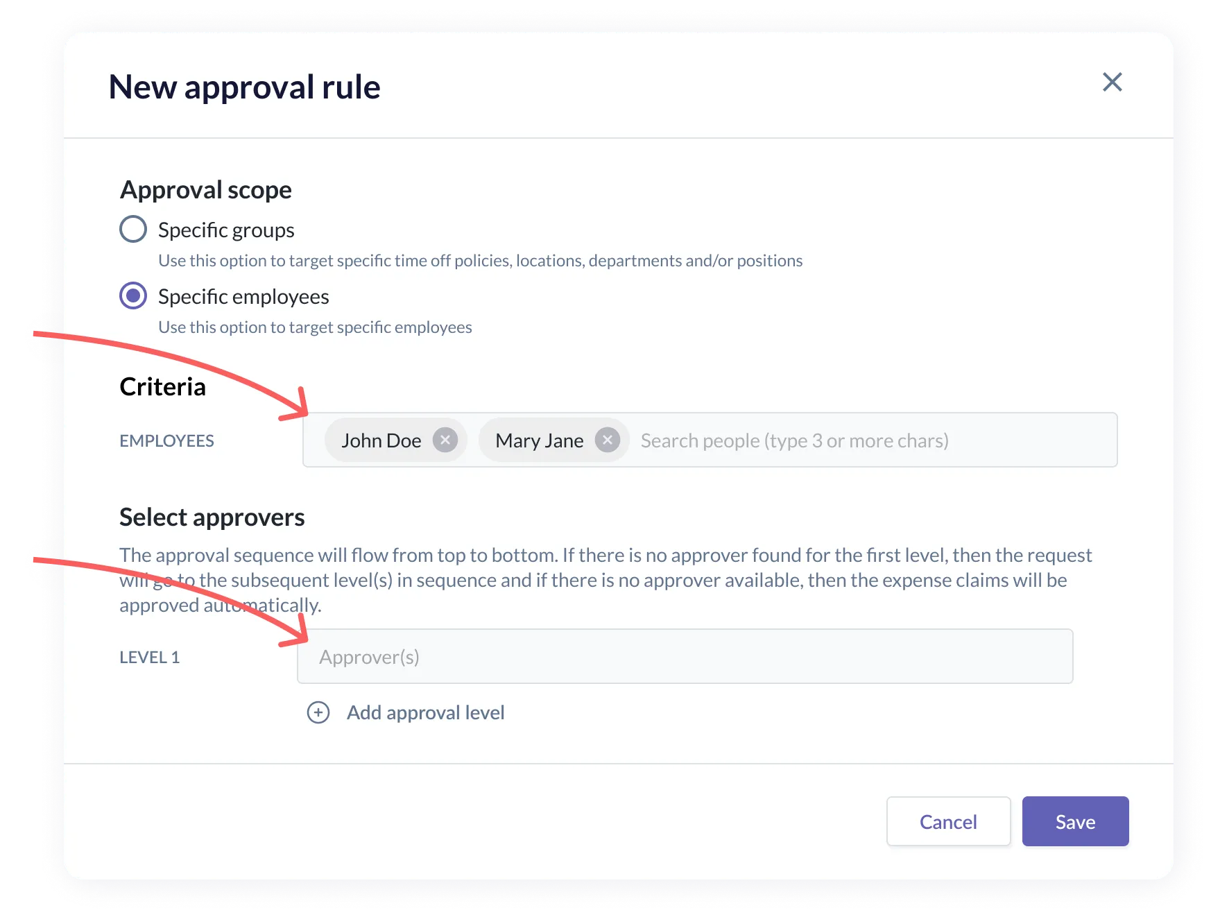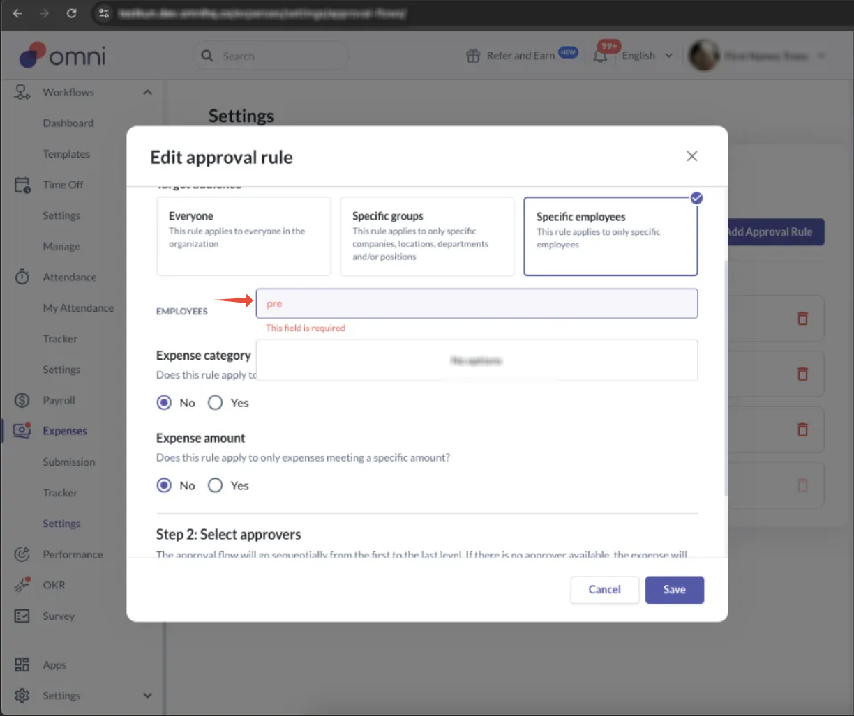 Settings > Approval Rules > Add Approval Rule → Specific Employees search