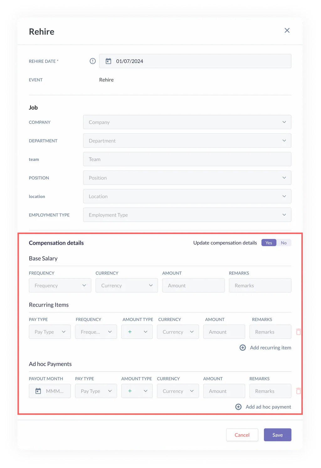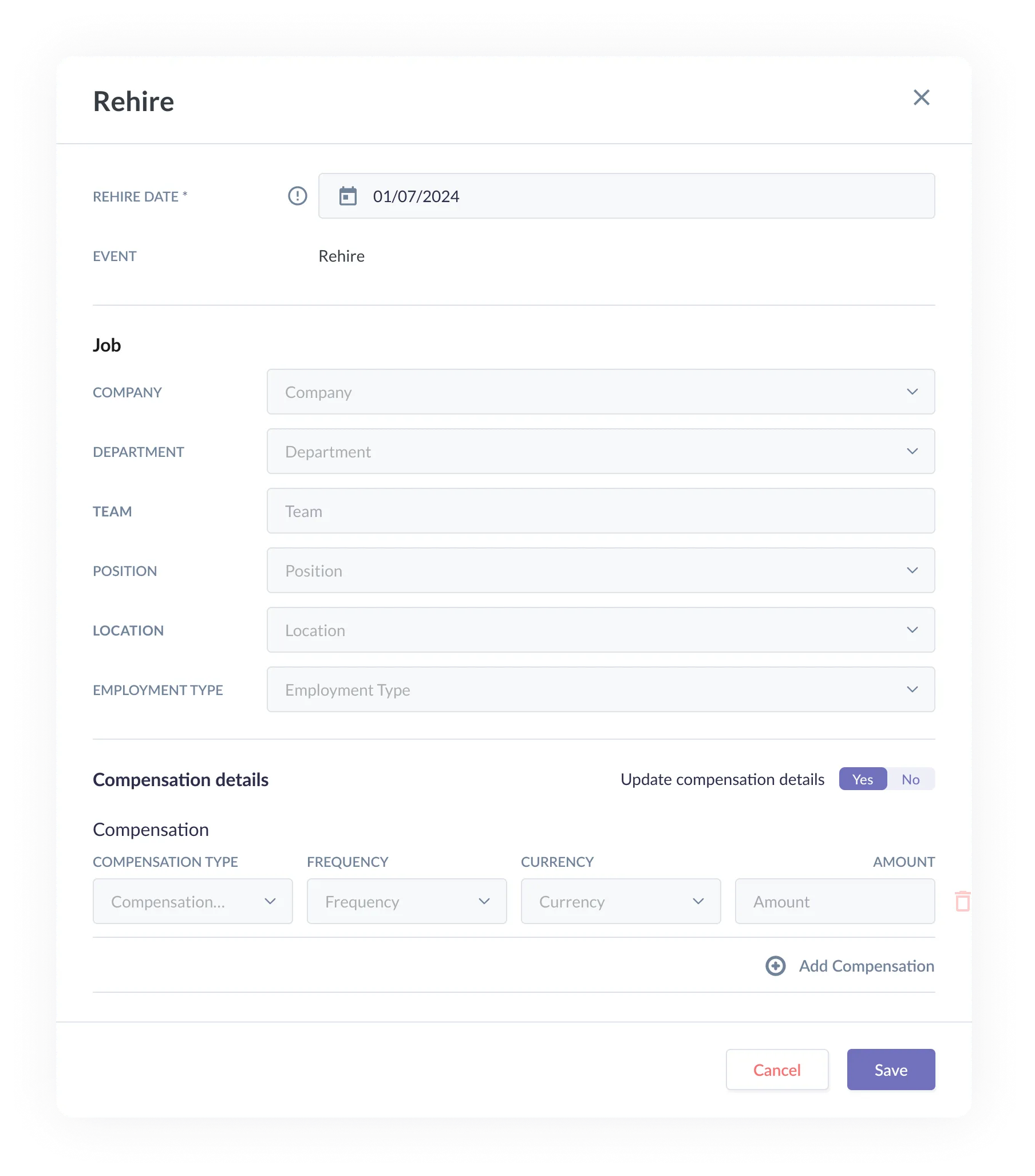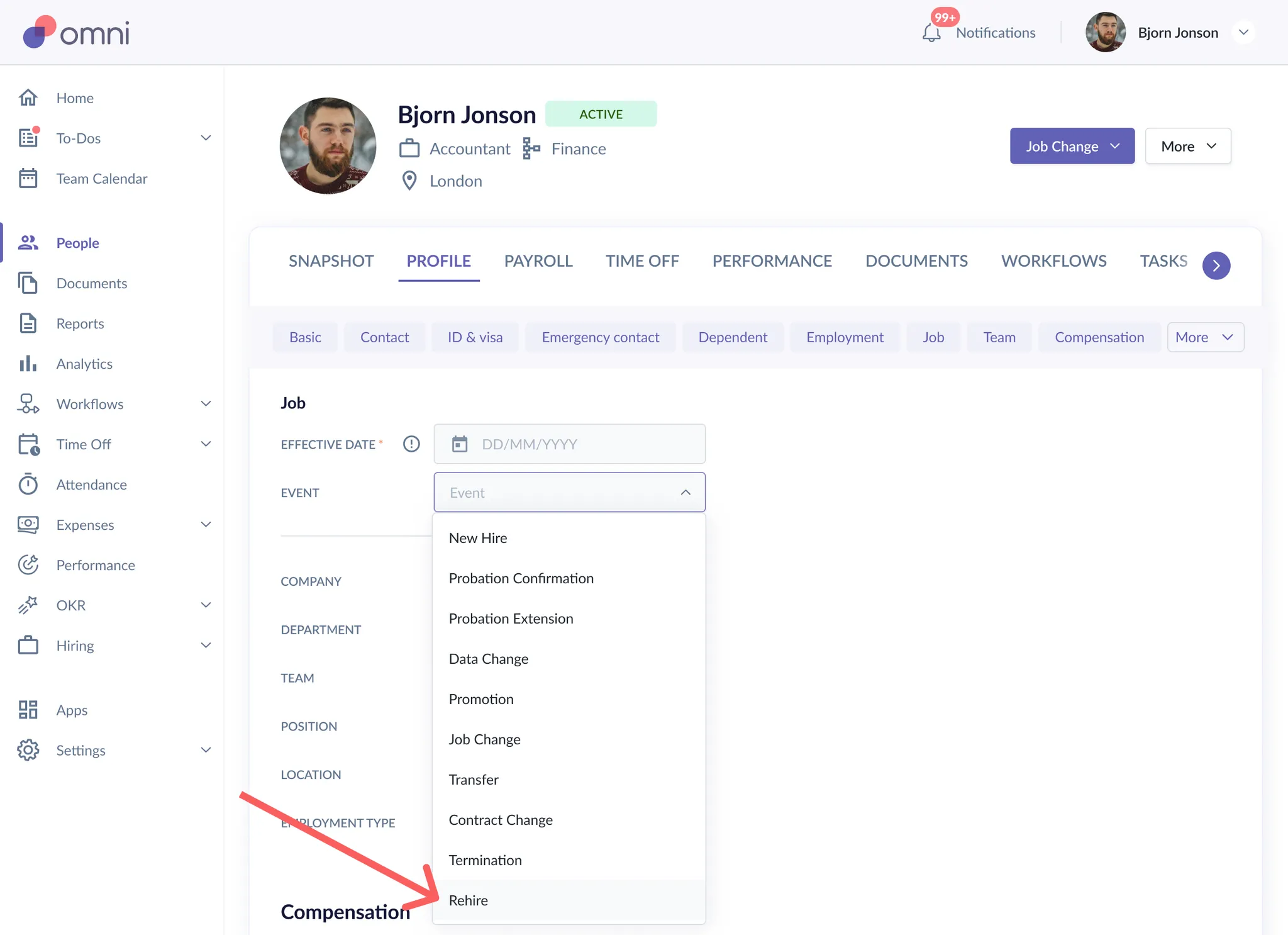 - If you require to add a rehire event for an existing or past employee, you can now do it with the introduction of the 'Rehire' job event.