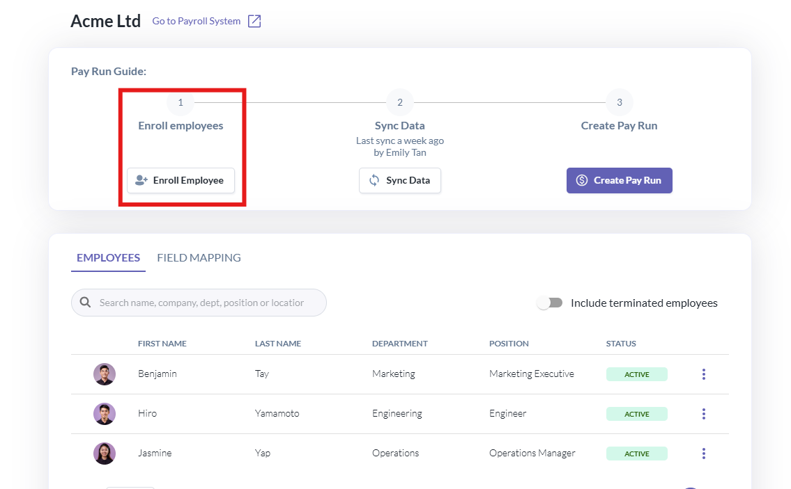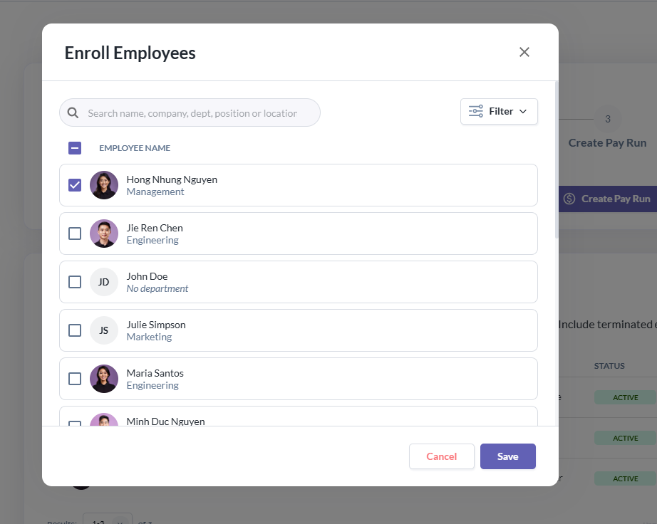 - If there are new employees not yet enrolled, complete Step 1: Enroll Employees. Select and tick the applicable employees, then click Save.