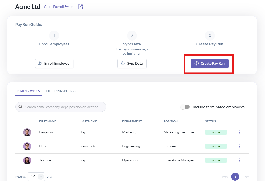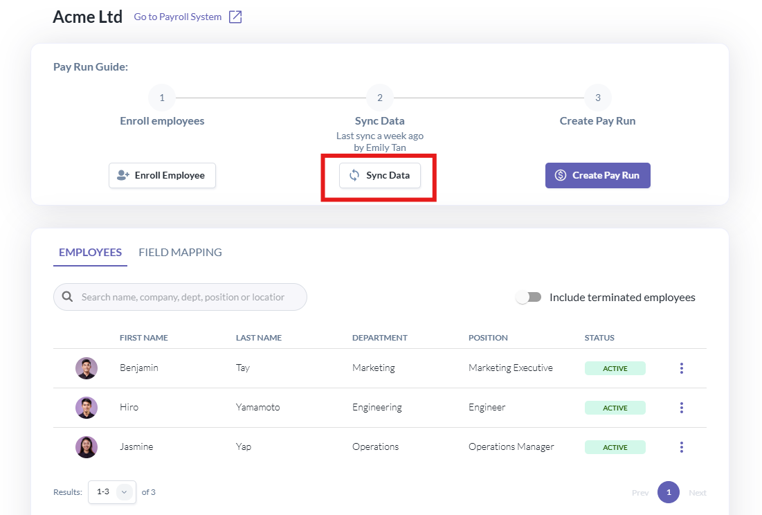 - Before creating a pay run, complete Step 2: Sync Data to ensure all monthly updates are captured in the payroll system. Syncing takes 1–2 minutes depending on the number of employees.