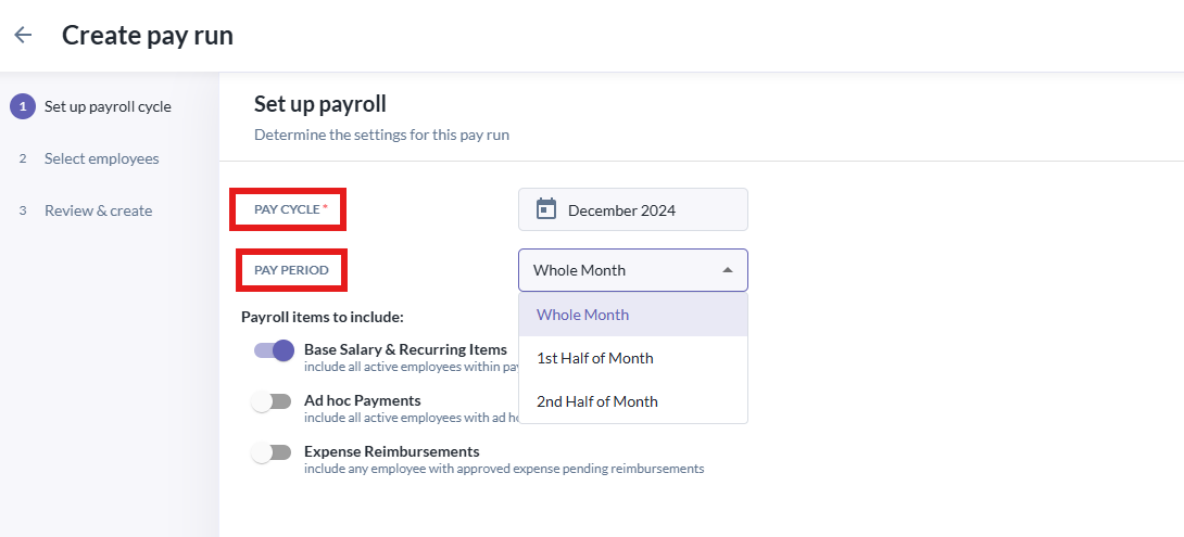 - For Pay Period, the default is the full month. You can change this to the 1st or 2nd half of the month if your entity runs payroll bi-weekly. (Note: Payroll in Singapore is usually processed on a whole month basis.)
