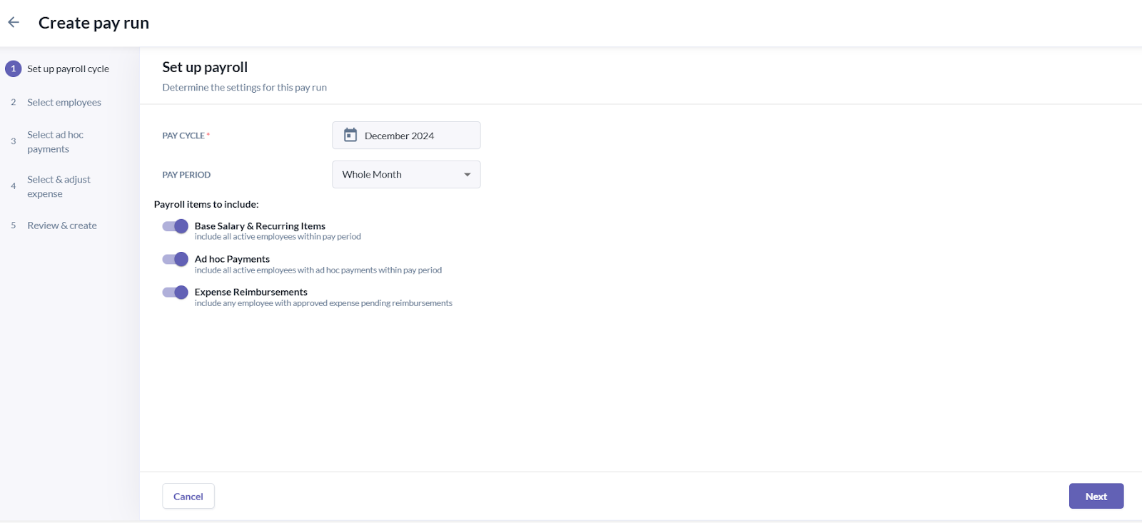 - By default, the Pay Cycle Month is set to the current month. To run payroll for a past or future month, select the appropriate period.