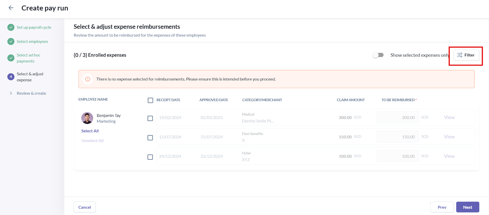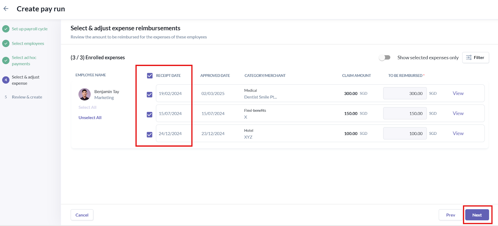 - After selecting the relevant expenses, click Next.
