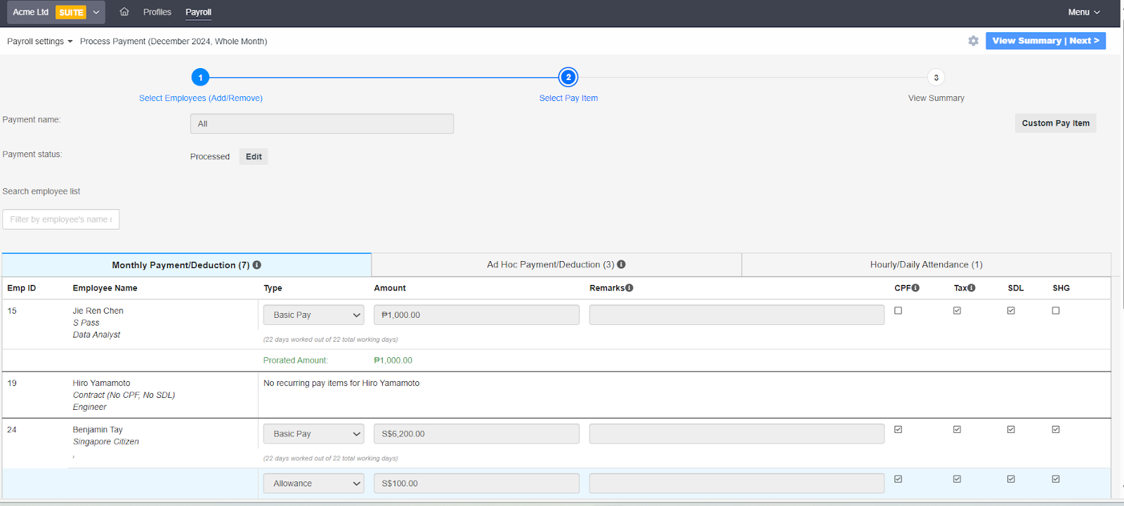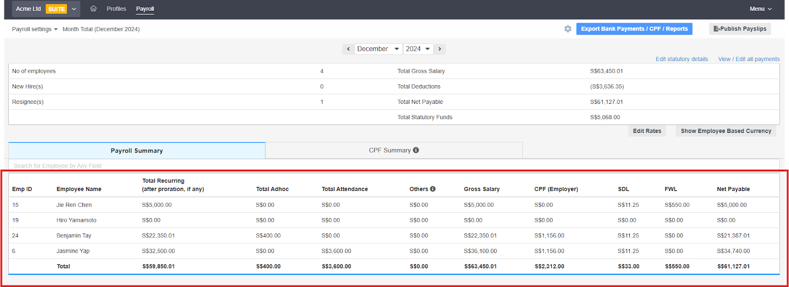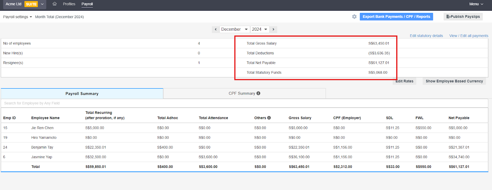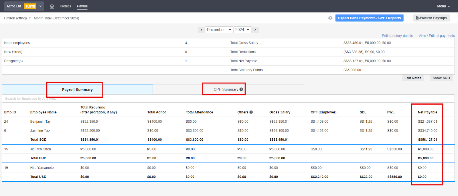 - The next screen displays the finalized payroll summary. It will show the net payable for each employee, and under the CPF Summary tab, you’ll find the breakdown of statutory contributions.