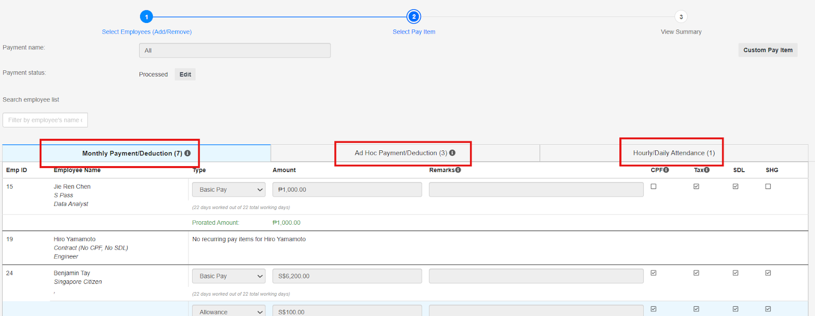 - Ad-hoc Payment/Deduction: Use this tab to add additional income or deductions specific to the current month’s payroll.