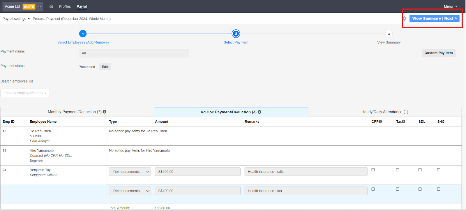 - The following screen will appear, showing a breakdown of payroll per employee. Click Process CPF & View Net Payment to finalize.