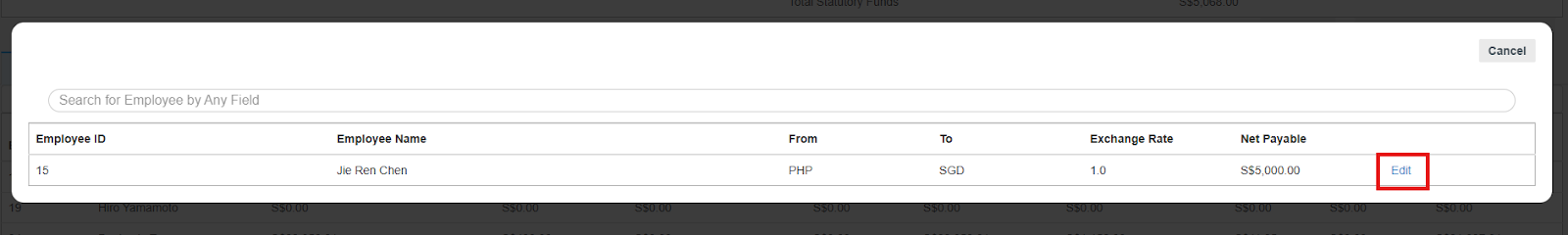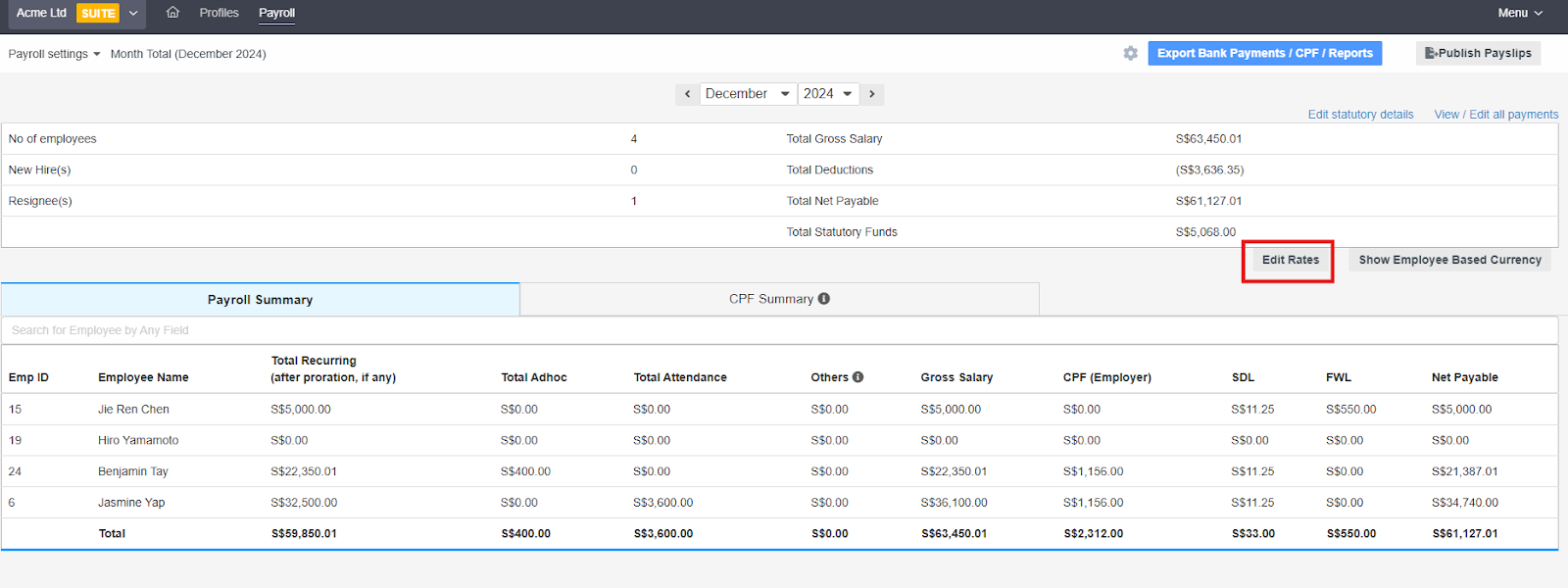 - In cases where payroll involves multi-currency, the payroll system allows you to edit the exchange rates. Click Edit Rates to update the preferred exchange rate for each employee's payroll.