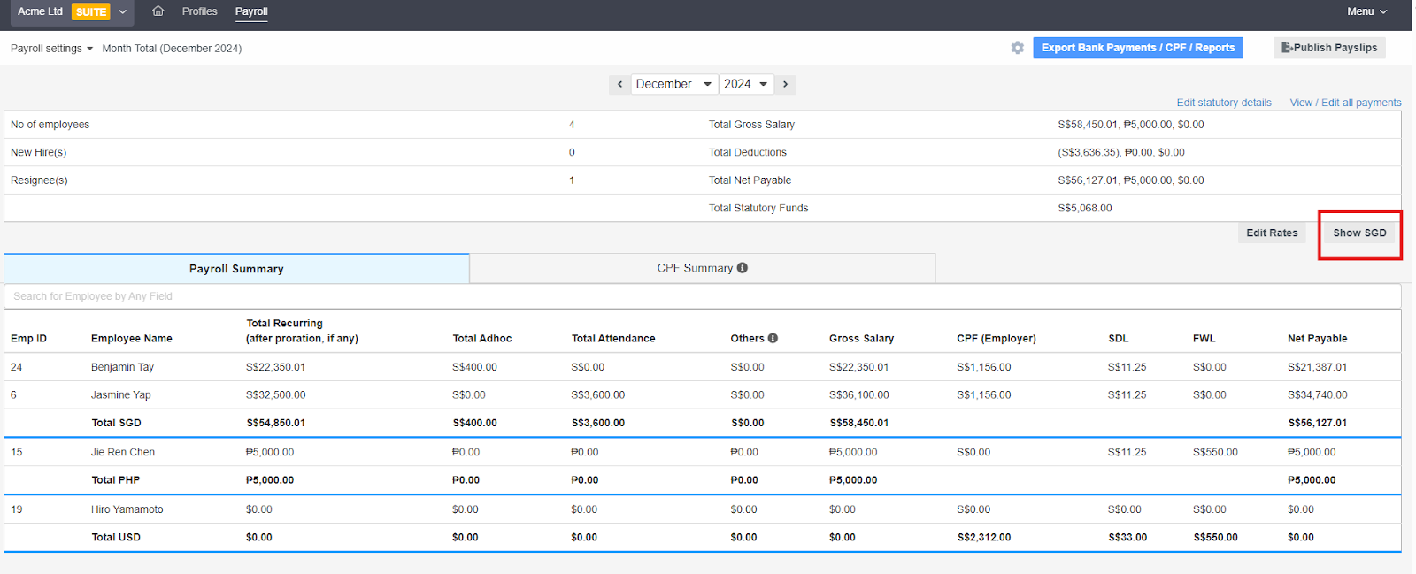 - You can also click Show SGD if you prefer to display the entire payroll summary in SGD for all employees. This simplifies viewing in a single currency.