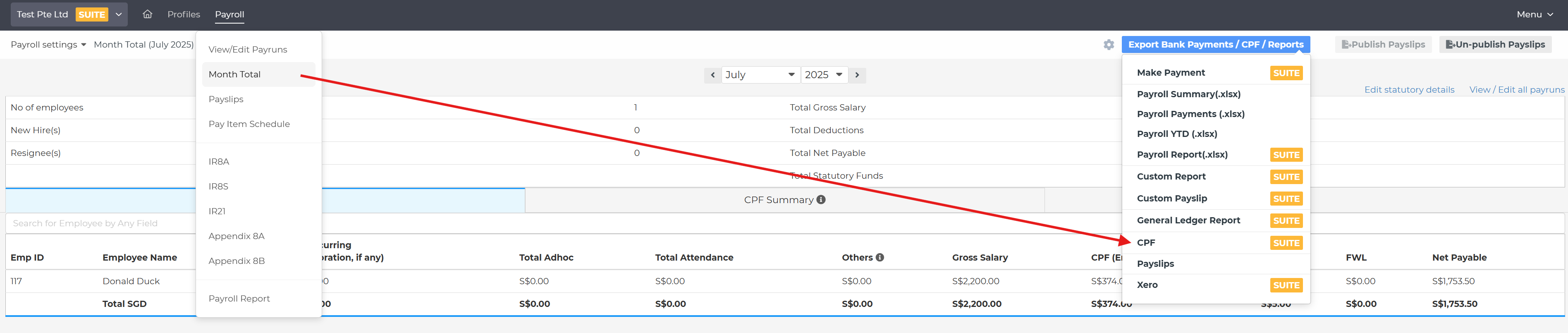 1) Inside Payroll system, go to Payroll > Month Total > Export Bank Payment / CPF / Reports > CPF:
