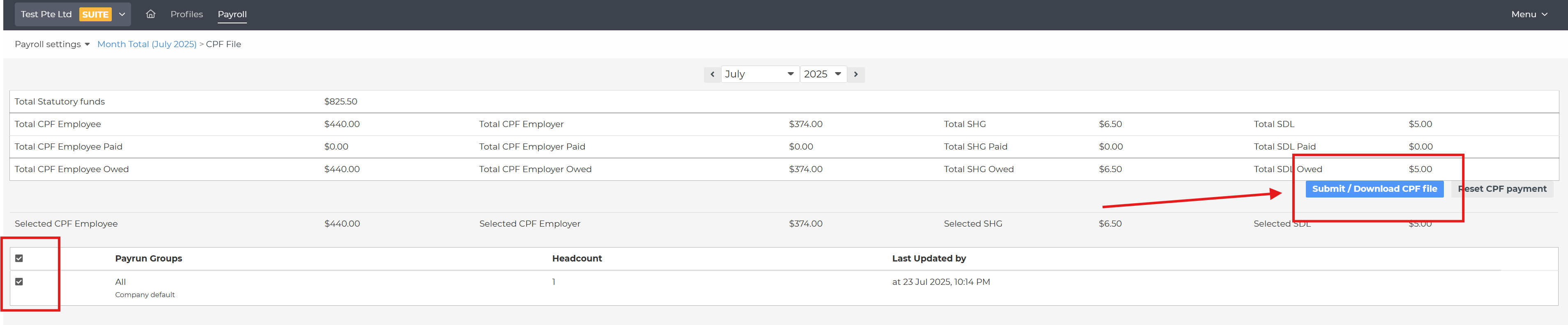 2) On the CPF File page, select the payrun groups you wish to include in the CPF submission. Then, click on the "Submit / Download CPF file" button to proceed.