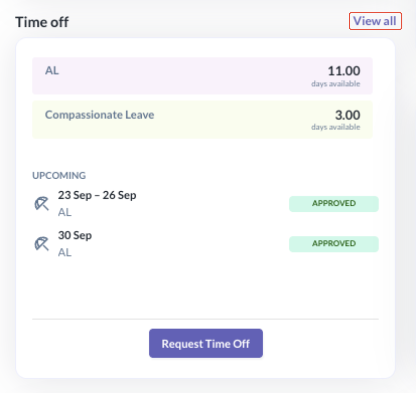 - If there are any time off applied, it will also be shown here, and you will be able to click into it to view further details of the application.
