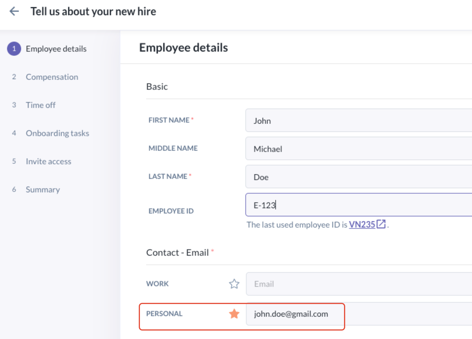 - Ensure you fill in the employee's personal email address and mark the email as primary