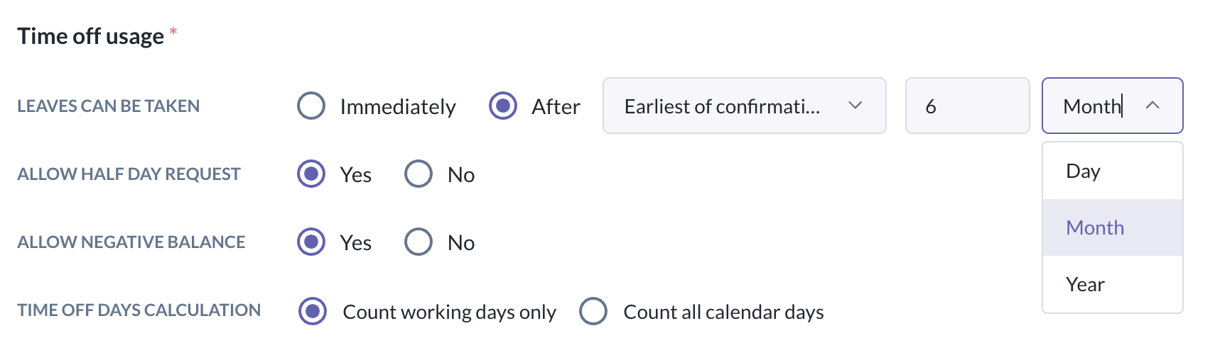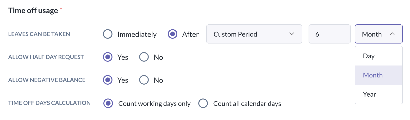 - If you select After > Custom Date, you can input the custom waiting period (in days, months, or years) for when the time off balance should become available to the employee.