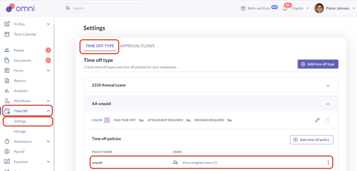 - Go to Time Off > Settings > Time Off Type > Select your Leave > Select your Policy