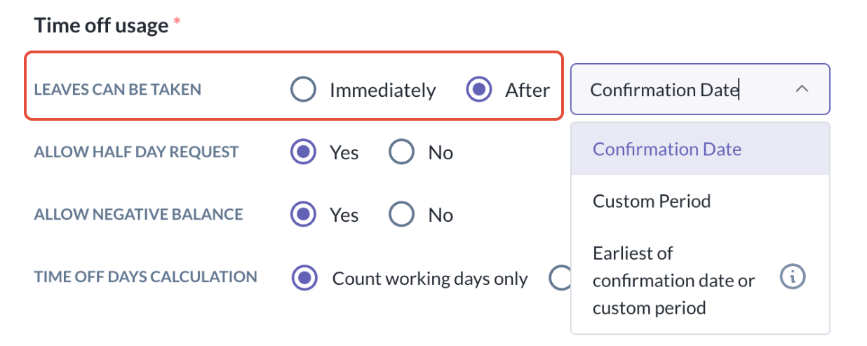 - If you select After > Earliest of Confirmation Date or Custom Period, the system will compare the custom waiting period you’ve set with the confirmation date under the Probation & Notice section, and apply whichever comes earlier.
