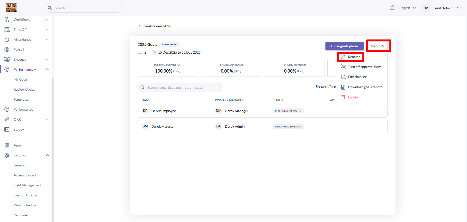 To rename a goal phase, click on the menu button and then click on rename. Rename the goal phase as you wish and click on the save button to save.