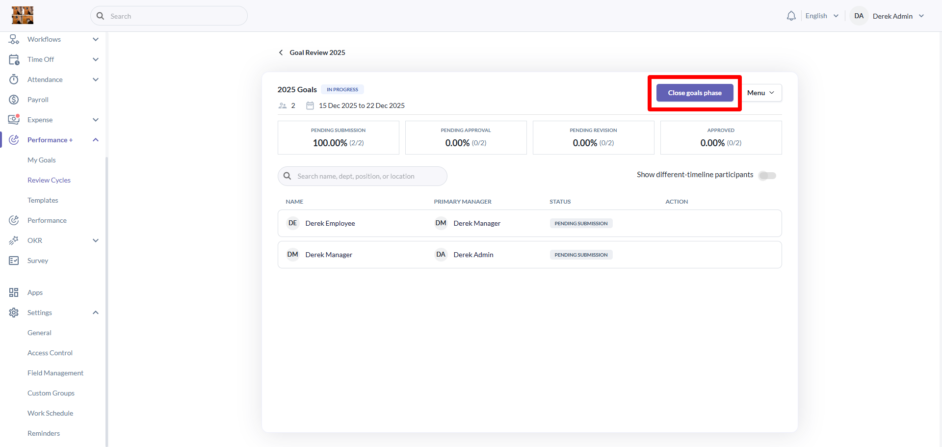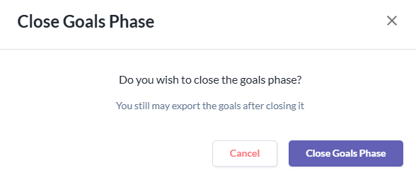 To close a goal phase, click on the close goal phase button then click on the close goal phase button on the popup to confirm action. This is also to prevent any accidents from closing the goal phase.