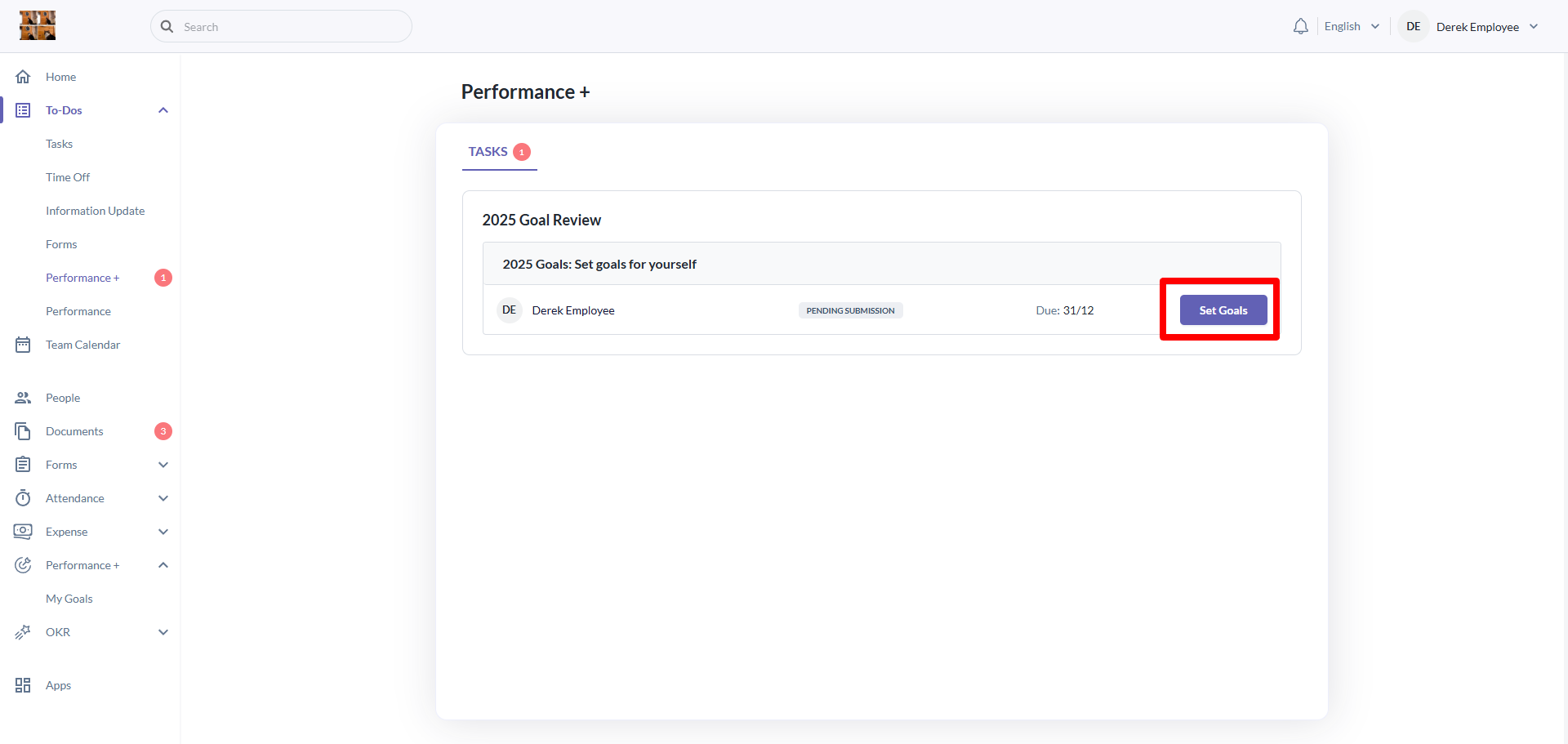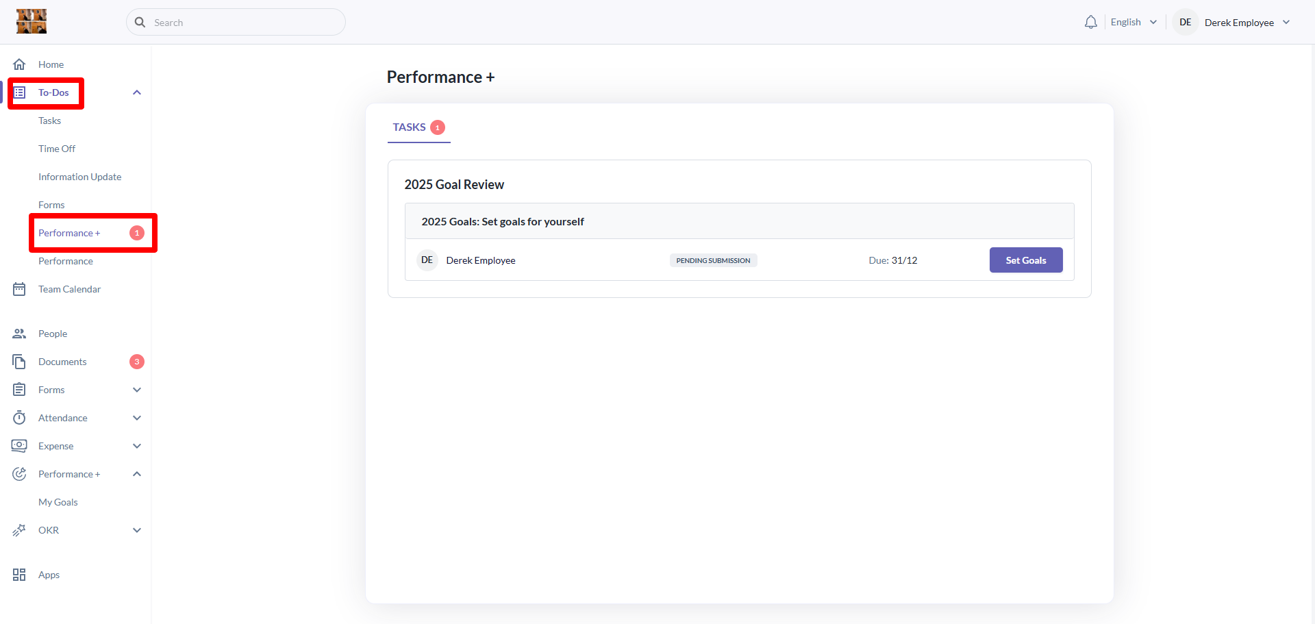 - Navigate to To-Dos > Performance+ > Tasks to do their goal setting.