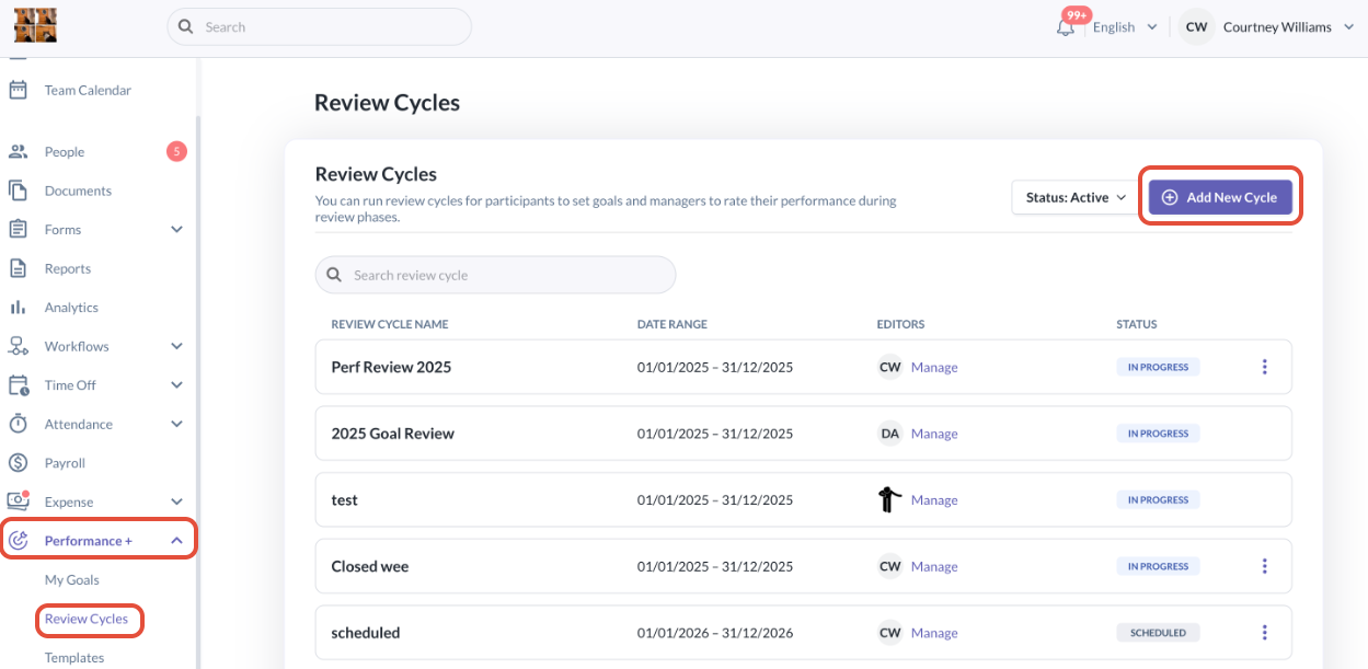 - Navigate to Performance + > Review Cycles > Add New Cycle