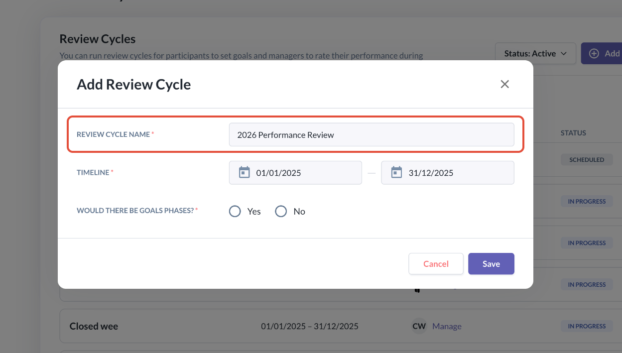 - A pop-up will appear where you can enter a Review Cycle name. This name is displayed to all participants throughout the review cycle period.