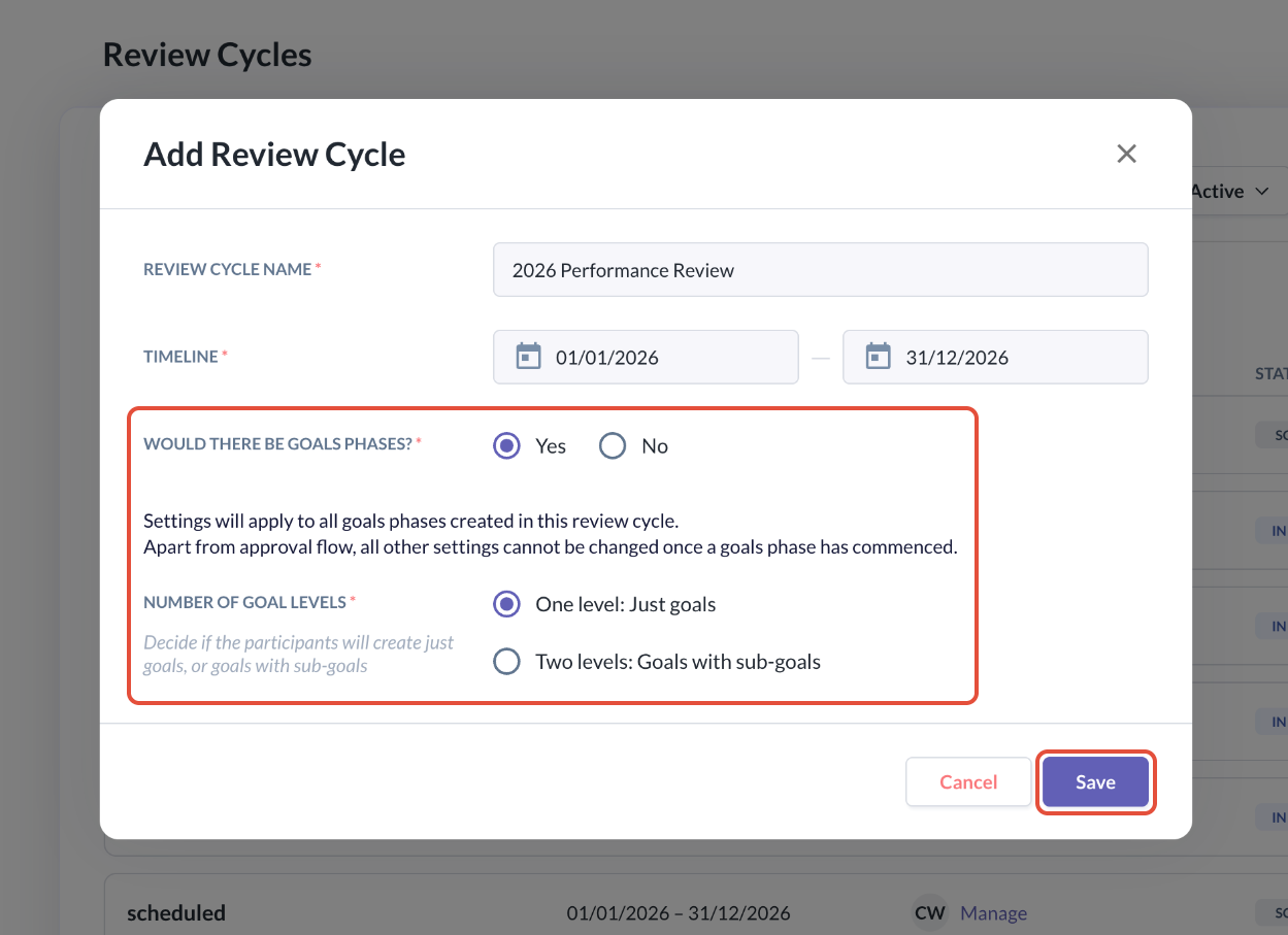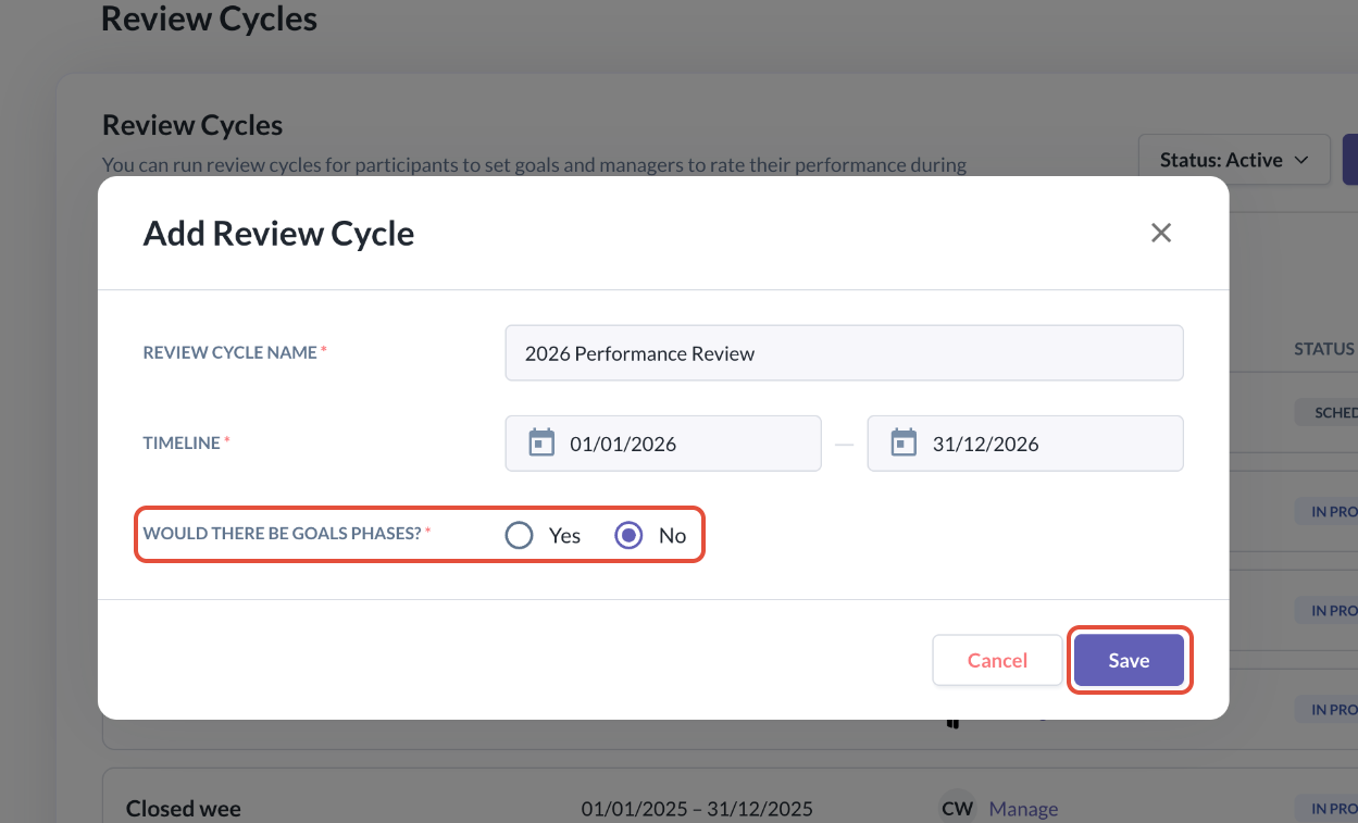- If you select No, the Review Cycle will not include a Goal Phase at all and you can proceed to click Save