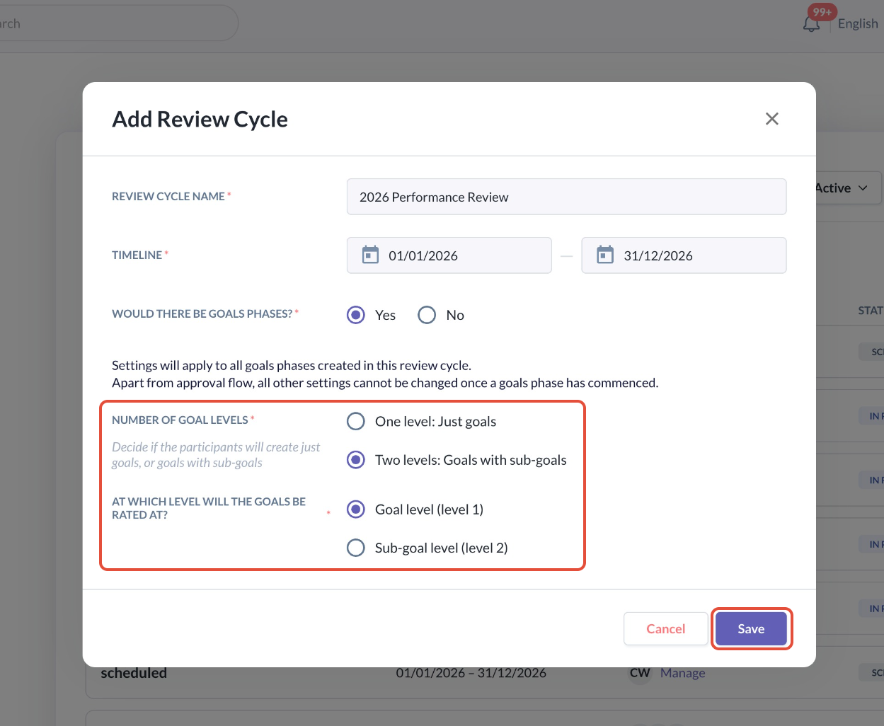 - If you choose to have two levels of goals, participants of the Review Cycle will need to create parent goals and also break them into sub-goals.
