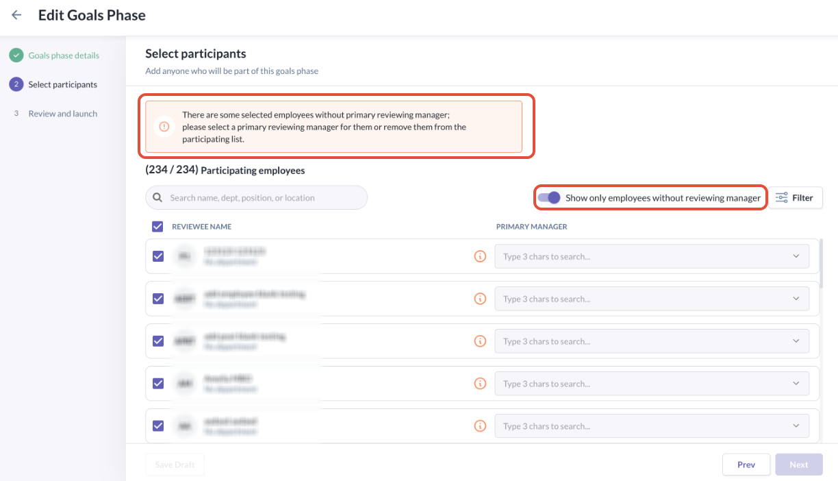- If approval by manager is toggled on, the system will also prompt admins to review and add primary managers or remove the participants from the selection. Admins can easily toggle Show only employees without reviewing manager to do this.