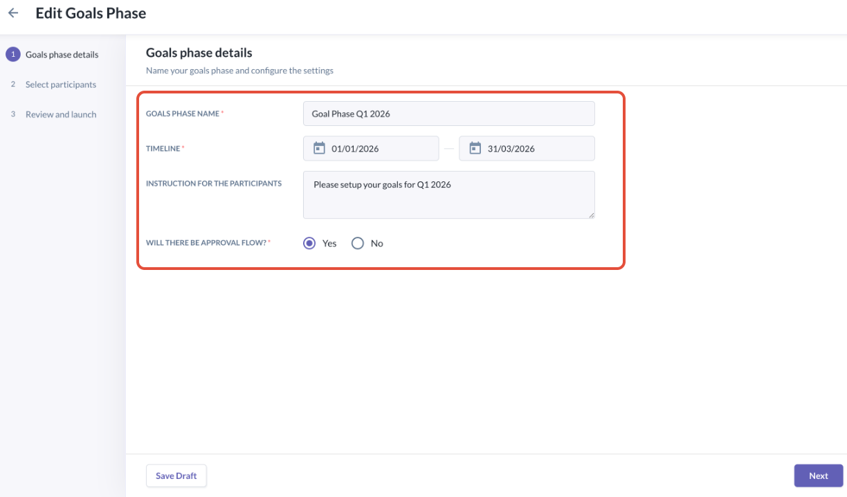 - Will there be approval flow? (Optional toggle if you require manager to review and approve goals set by participants)