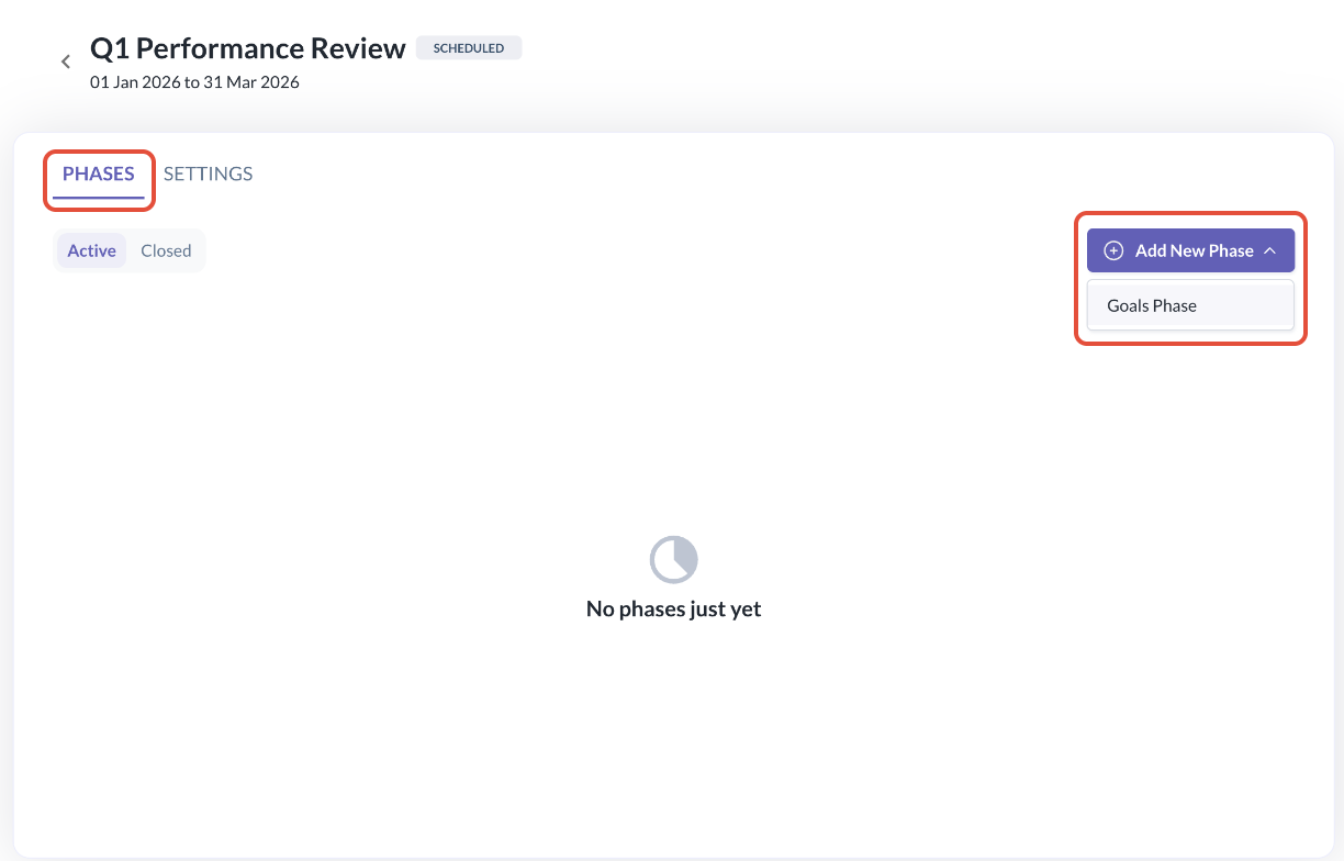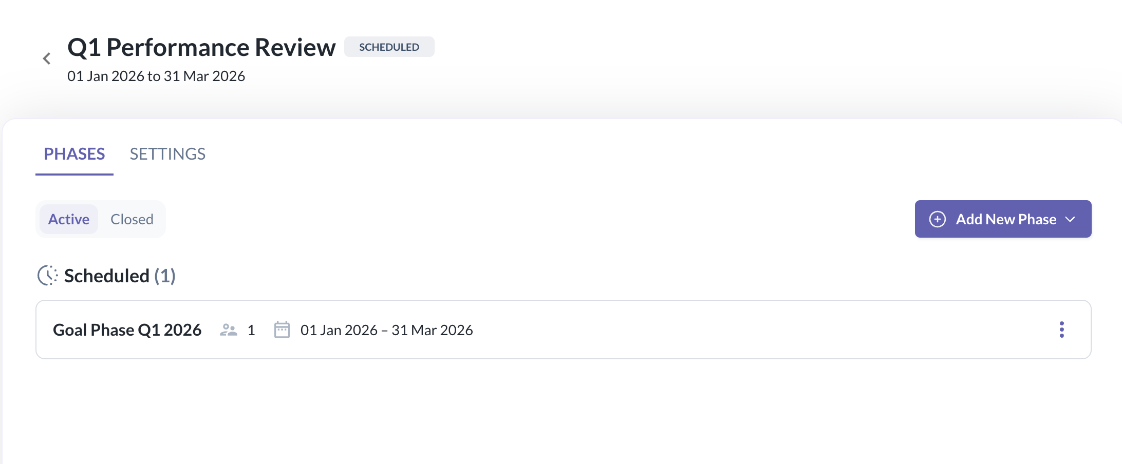- Inside any Review Cycle i.e. Q1 Performance Review, admins can now open the Phases tab and select Add New Phase > Goal Phase.
