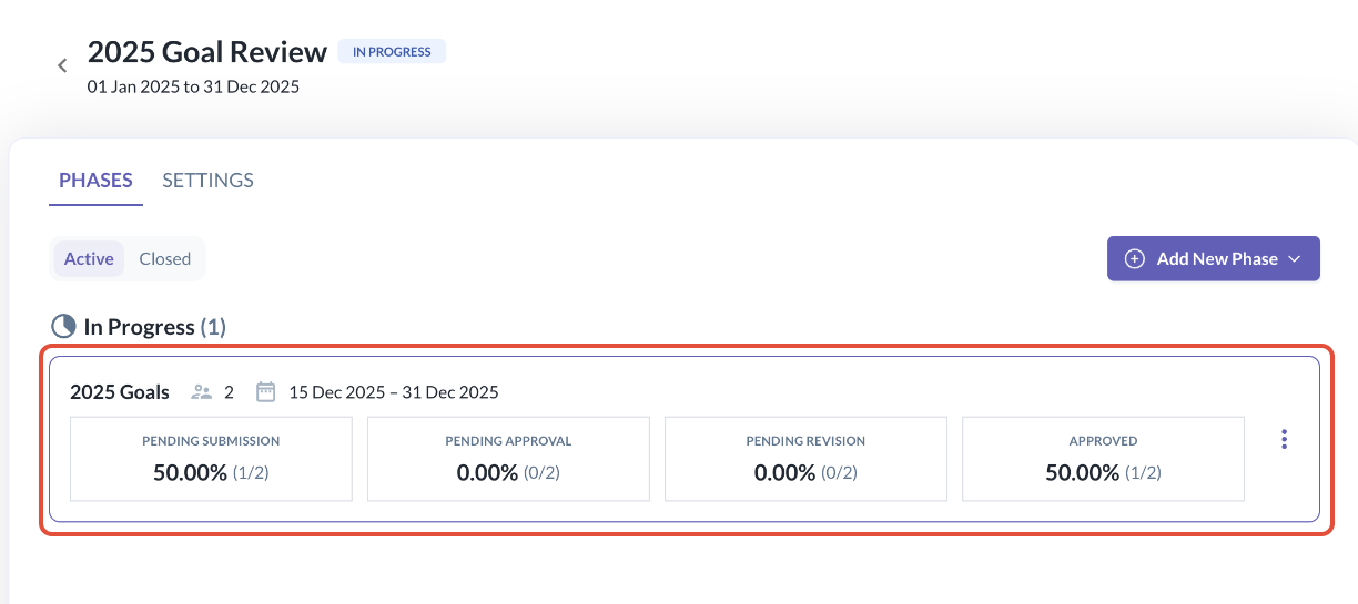 - Inside any Review Cycle that is active i.e. 2025 Goal Review, admins can navigate to the Goal Phase via the Phases tab.