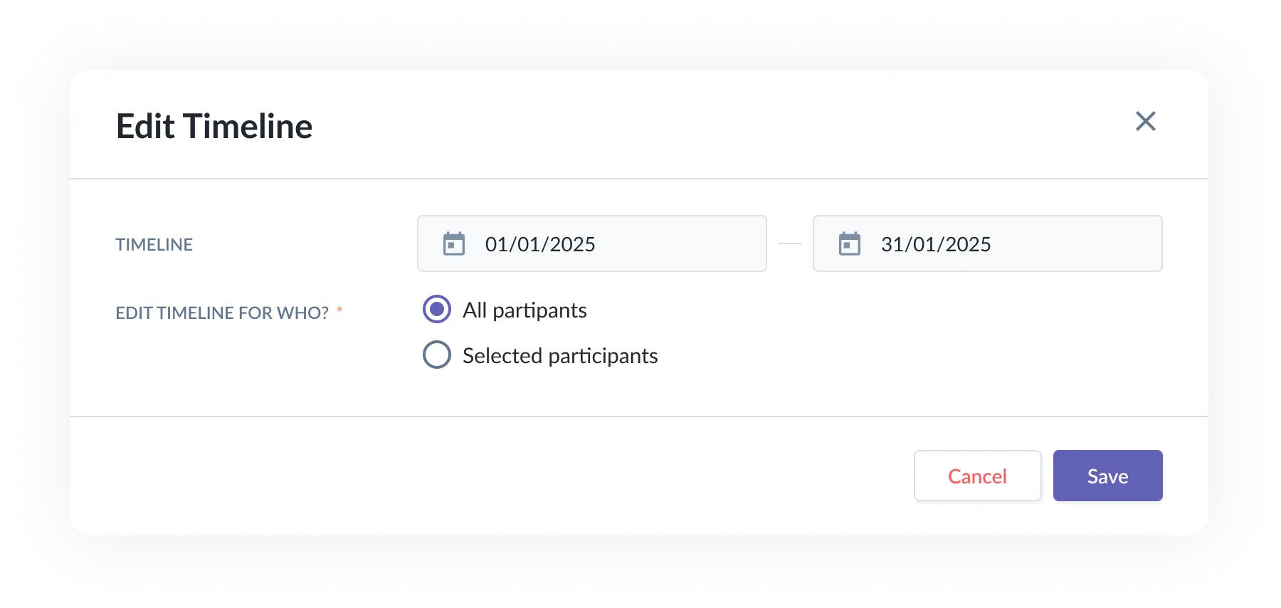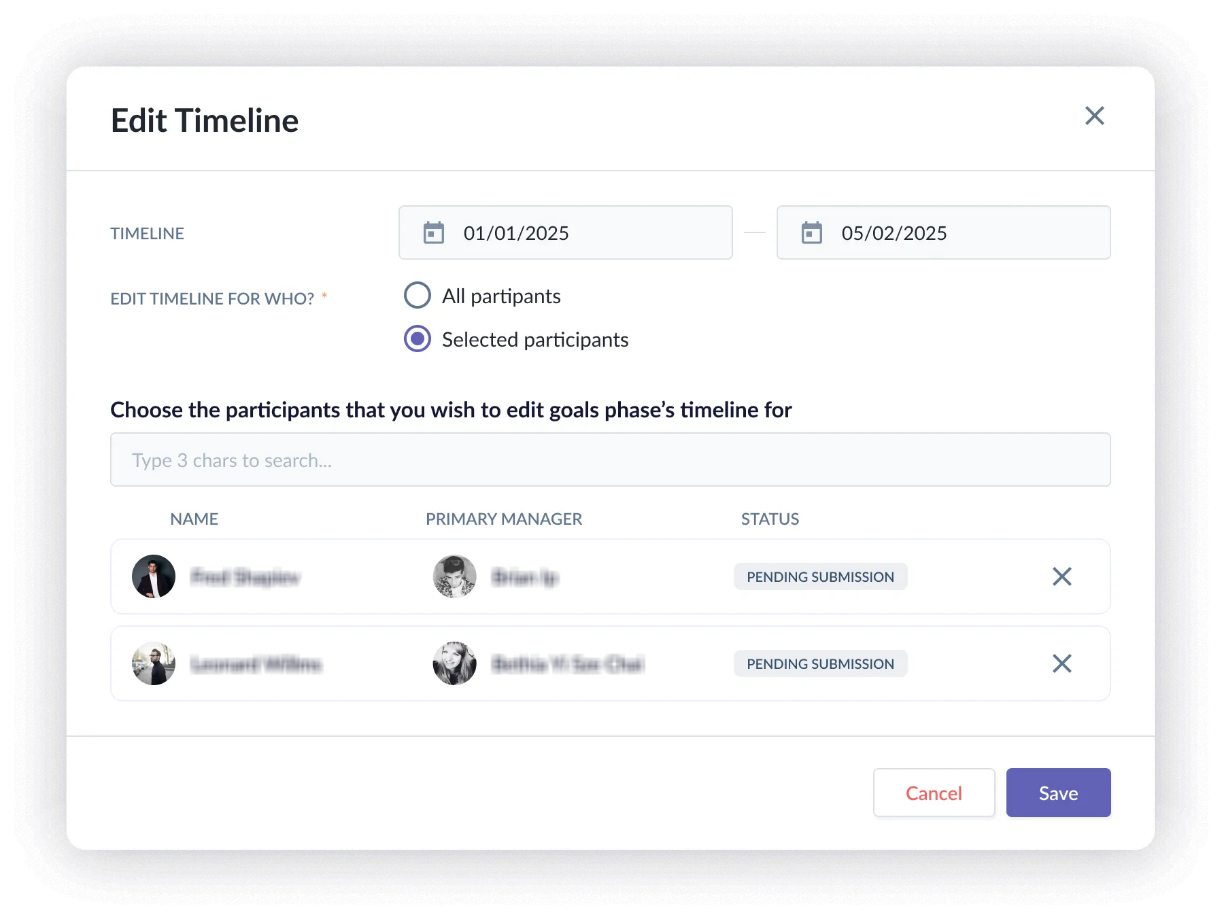 - When choosing Selected participants, the admin updates the timeline for specific participants only.